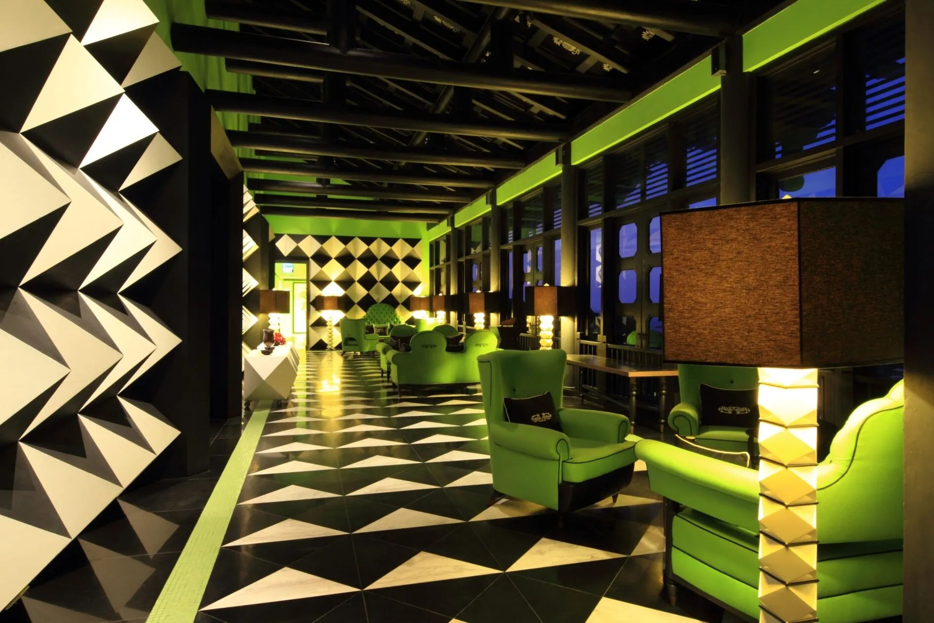 - Great Hall Foyer — фойе Большого зала – крытое пространство, примыкающее к главному бальному залу площадью 75 кв.м может разместить от 40 до 80 человек. Это стильное фойе напоминает художественную галерею благодаря яркому современному черно-белому декору с оттенками кислотно-зеленого. Его с любовью называют ‘комнатой зебры’, а прекрасным дополнением является панорамное окно, проходящее по всей длине галереи, откуда открывается захватывающий вид на горы, лагуну и море.