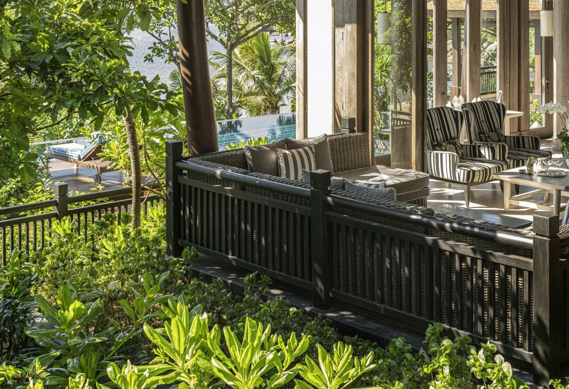 - One-Bedroom Seaside Villa on the Rocks — расположенная в тихом уголке на скалах над живописной частной бухтой стильная вилла на сваях площадью 220 кв.м, с прекрасным видом на море и пляж, состоящая из спальни с кровать King-size под балдахином под сводчатым потолком и удобной нишей для отдыха с телевизором и очень большой кушеткой, рабочей зоны с письменным столом, отдельной гостиной, гардеробной, отделанной мрамором стильной ванной комнаты с изготовленной на заказ большой каменной ванной в отдельном купальном уголке, отдельной душевой кабиной с тропическим душем и двумя раковинами, большой частной меблированной террасы с гостиной зоной на открытом воздухе, с садом, частным пейзажным бассейном с собственной террасой для загара.