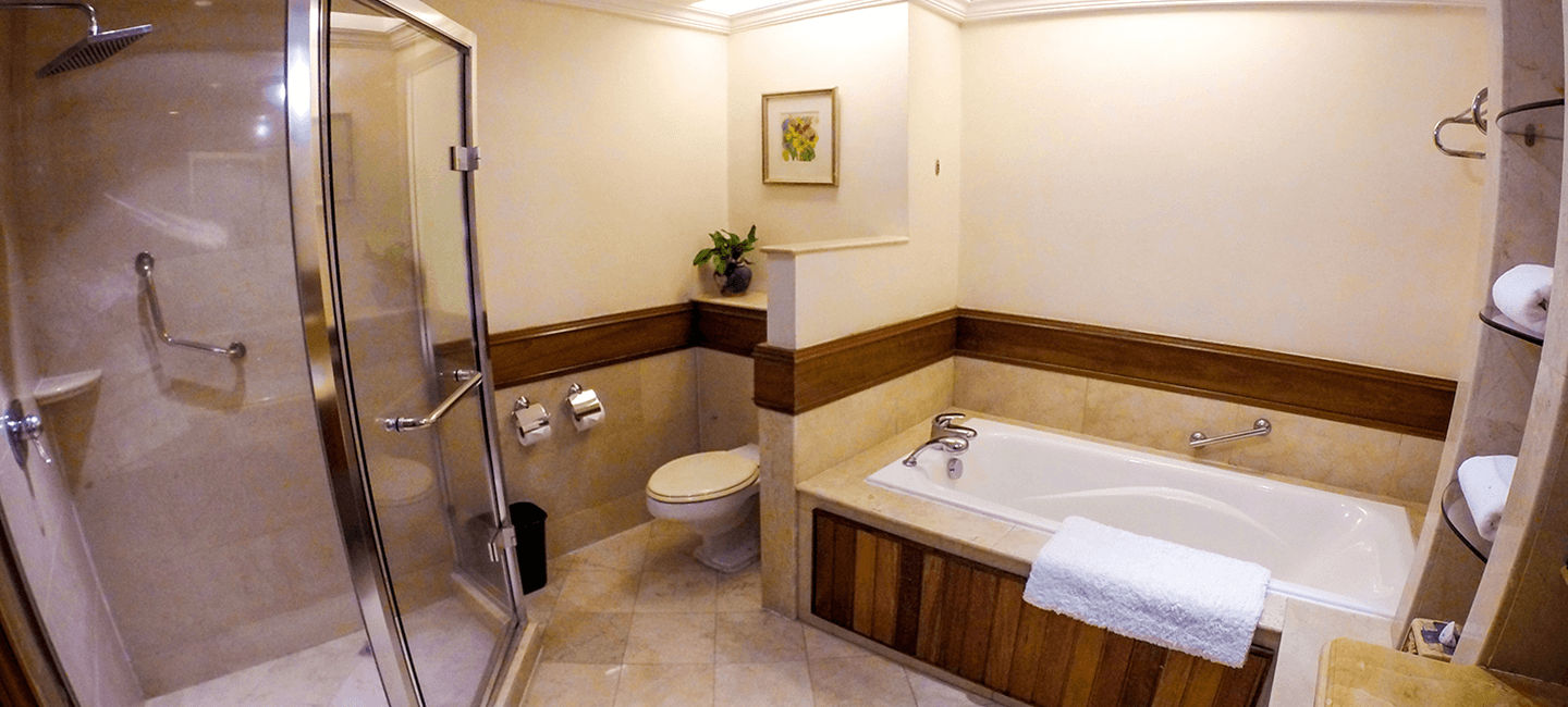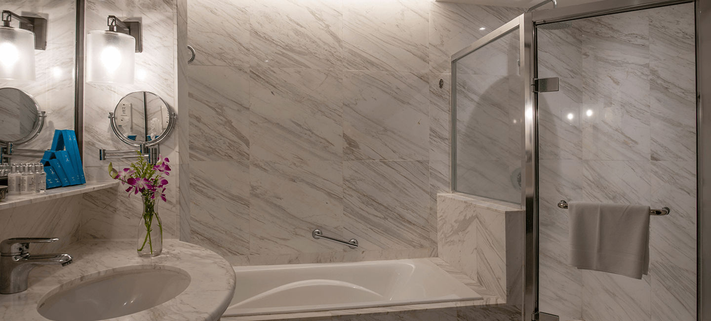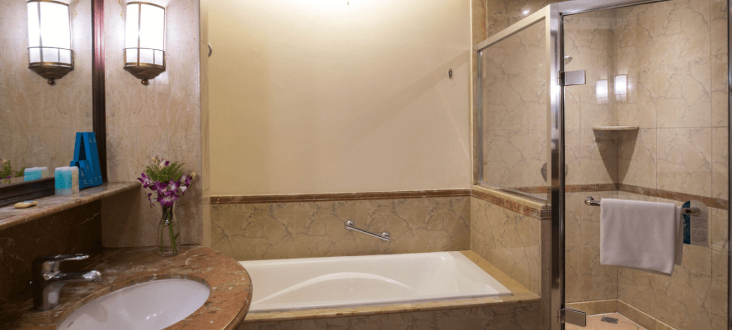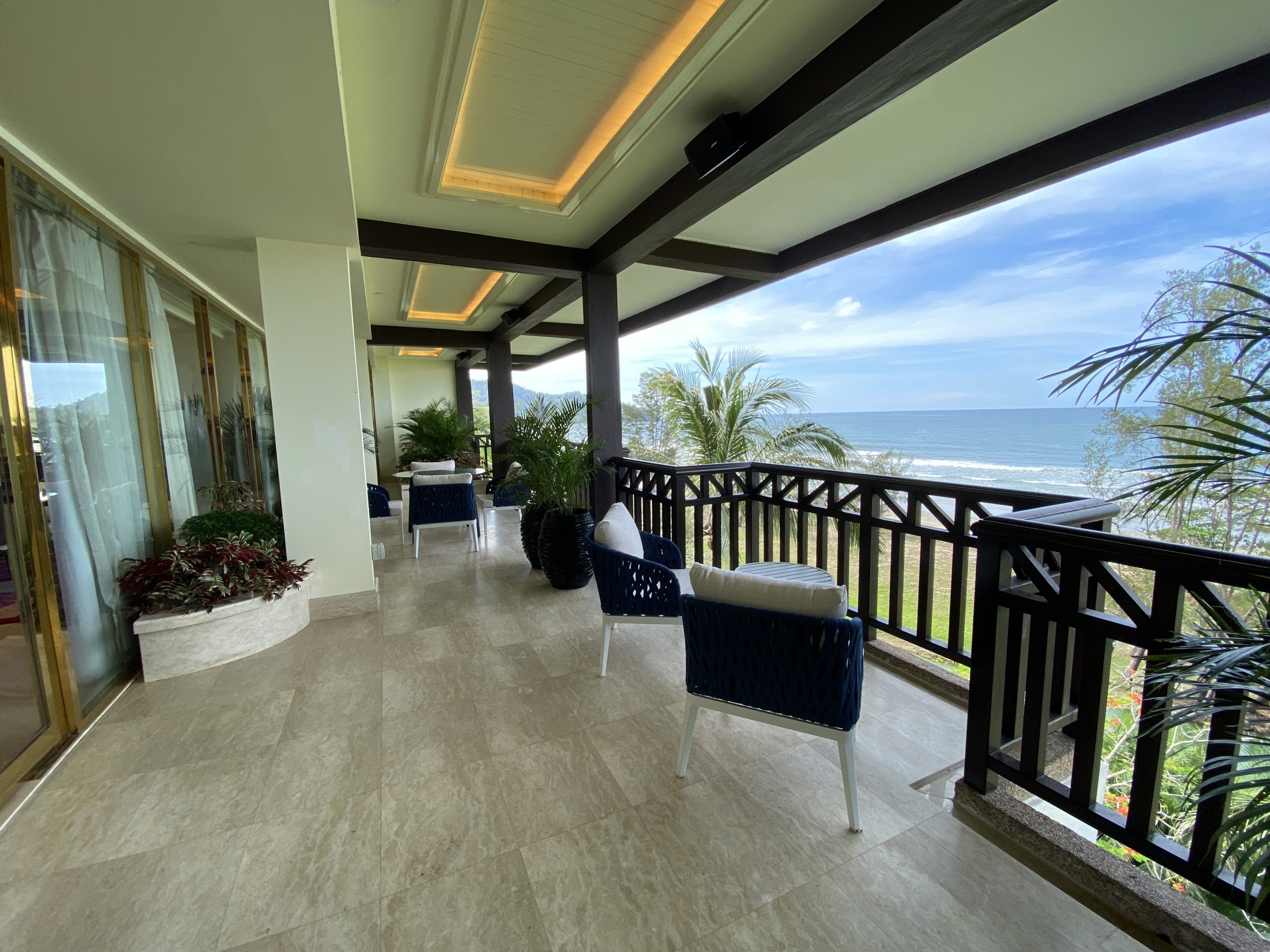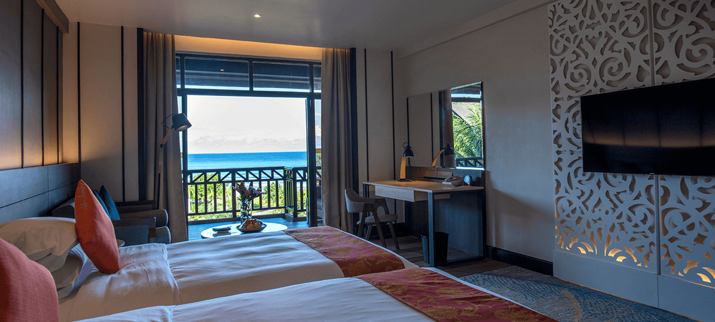 Гостям номеров предлагается превосходный уровень персонализированного обслуживания; гости могут посещать эксклюзивный частный лаунж, где ежедневно подаются вечерние коктейли. - Ocean Panorama Deluxe Room — расположенные с 1 по 2 этажи здания с лифтом номера площадью 42.5 кв.м, выходящие окнами на ботанический сад и бескрайние просторы Южно-Китайского моря, состоящие из спальни, небольшой гостиной зоны, рабочей зоны с письменным столом, ванной комнаты с ванной и отдельной душевой кабиной, частного меблированного балкона или террасы.