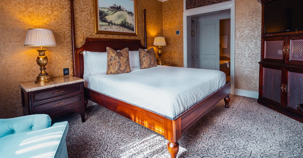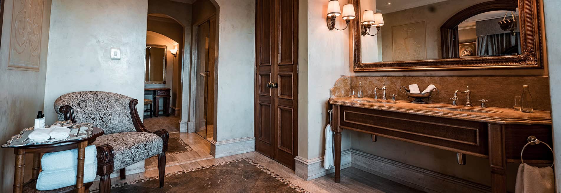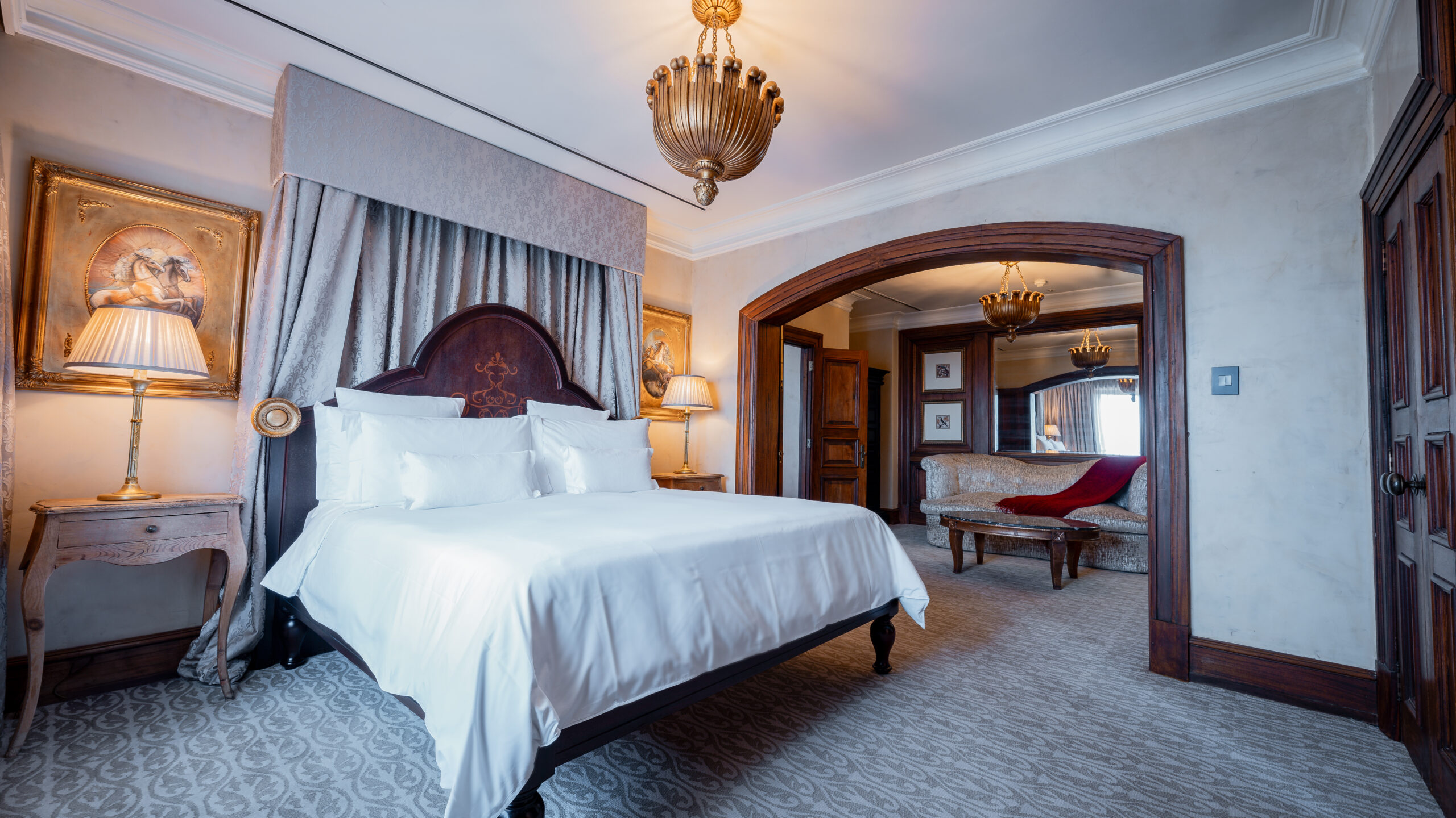 По обе стороны люкса расположены два отдельных балкона, с которых открывается захватывающий вид на городской пейзаж Фоурвейса и горы Магалисбург вдалеке.