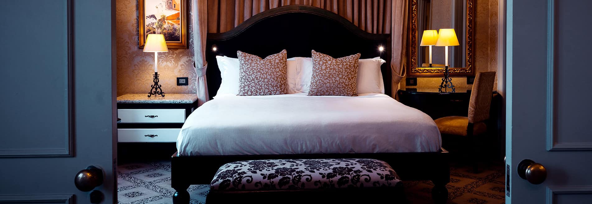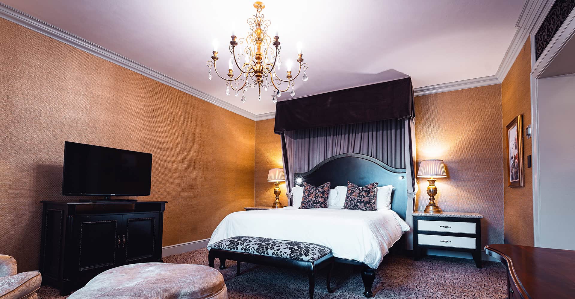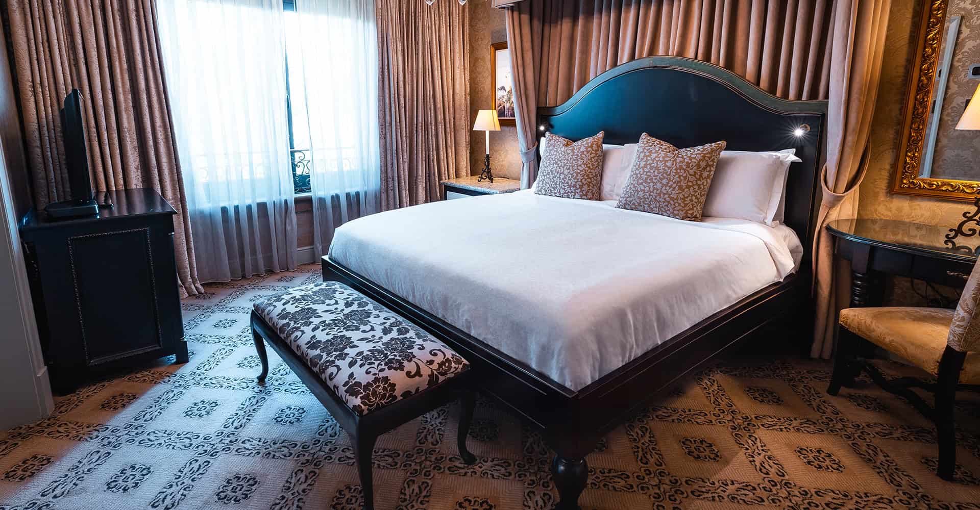 По обе стороны люкса расположены два отдельных балкона, с которых открывается захватывающий вид на городской пейзаж Фоурвейса и горы Магалисбург вдалеке.