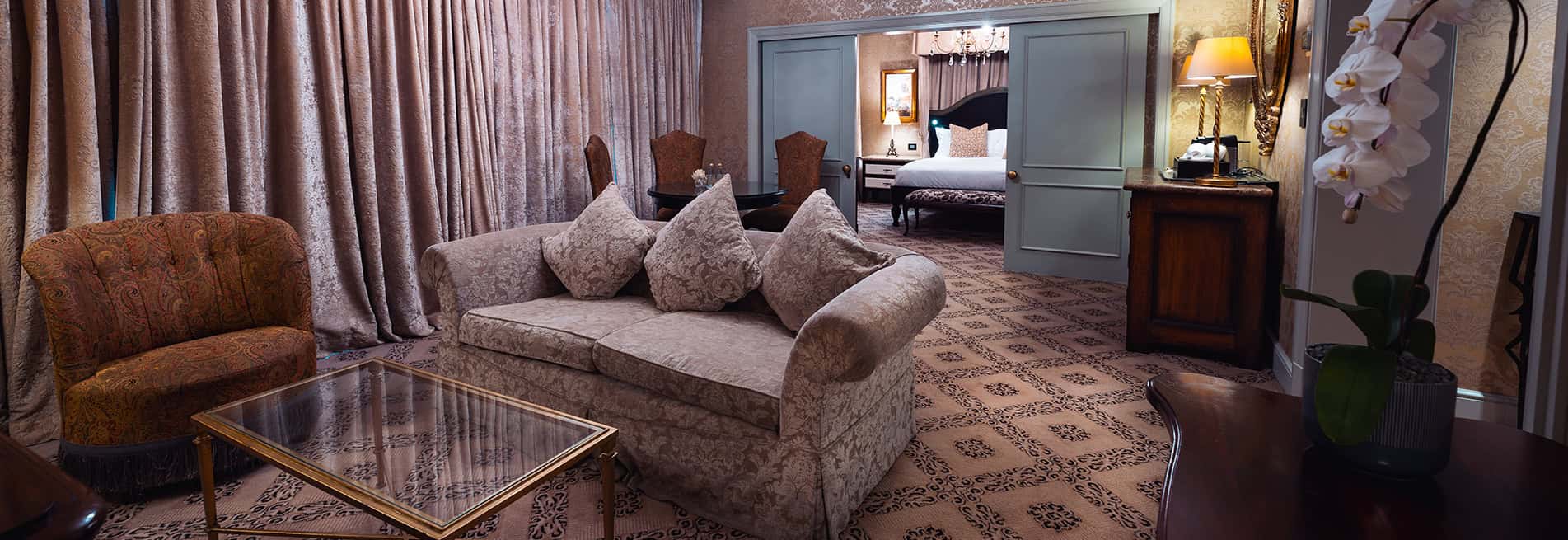 Рассчитаны для максимум 2 гостей. - Suites — 10 просторных люксов площадью 63 кв.м, с потрясающим видом на романтические ландшафтные сады отеля и впечатляющий открытый бассейн, состоящих из небольшого холла, просторной спальни с одной большой двуспальной кроватью King-size, отдельной гостиной комнаты, столовой зоны с обеденным столом, рабочей зоны с большим письменным столом, гардеробной, роскошной ванной комнаты.
