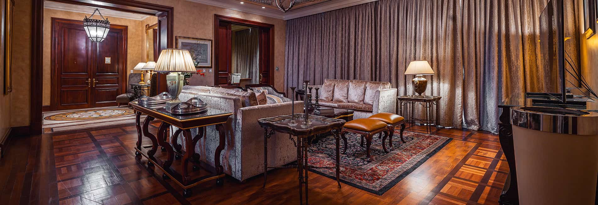 Рассчитаны для максимум 2 гостей. - Presidential Suite — 1 роскошный президентский люкс площадью 168 кв.м, с видом на тихие сады и сверкающий бассейн, состоящий из большого холла, просторной спальни с одной большой двуспальной кроватью King-size, отдельной гостиной комнаты, отдельного рабочего кабинета с большим письменным столом, отдельной столовой с обеденным столом, небольшой оборудованной кухни, гардеробной, роскошной ванной комнаты, гостевого туалета, частного балкона.