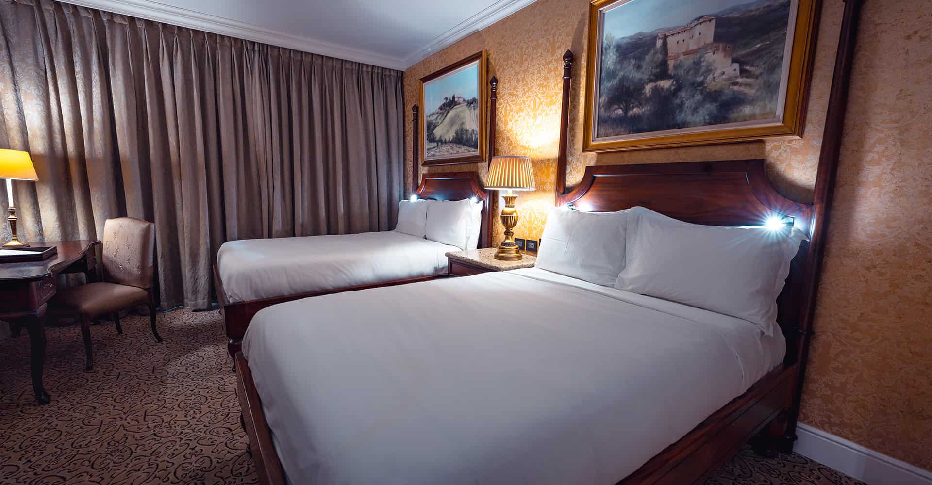 Рассчитаны для максимум 2 гостей. - Family Rooms — 64 семейных номера повышенной комфортности с видом на великолепные ландшафтные сады в тосканском стиле, состоящих из спальни с двумя двуспальными кроватями Twin, небольшой гостиной/рабочей зоны с письменным столом, просторной ванной комнаты с большой душевой кабиной.
