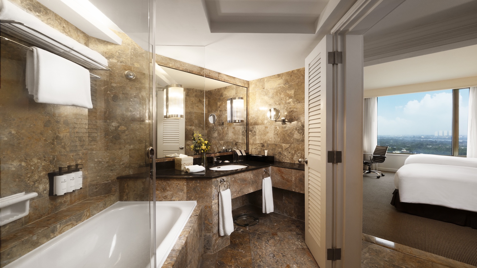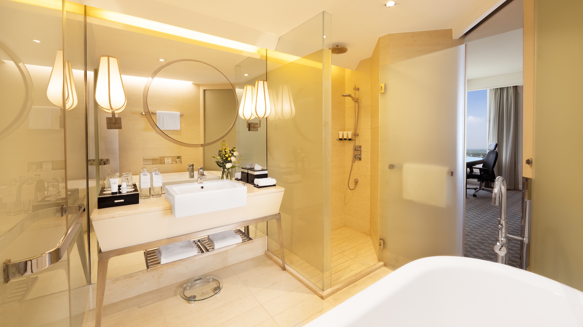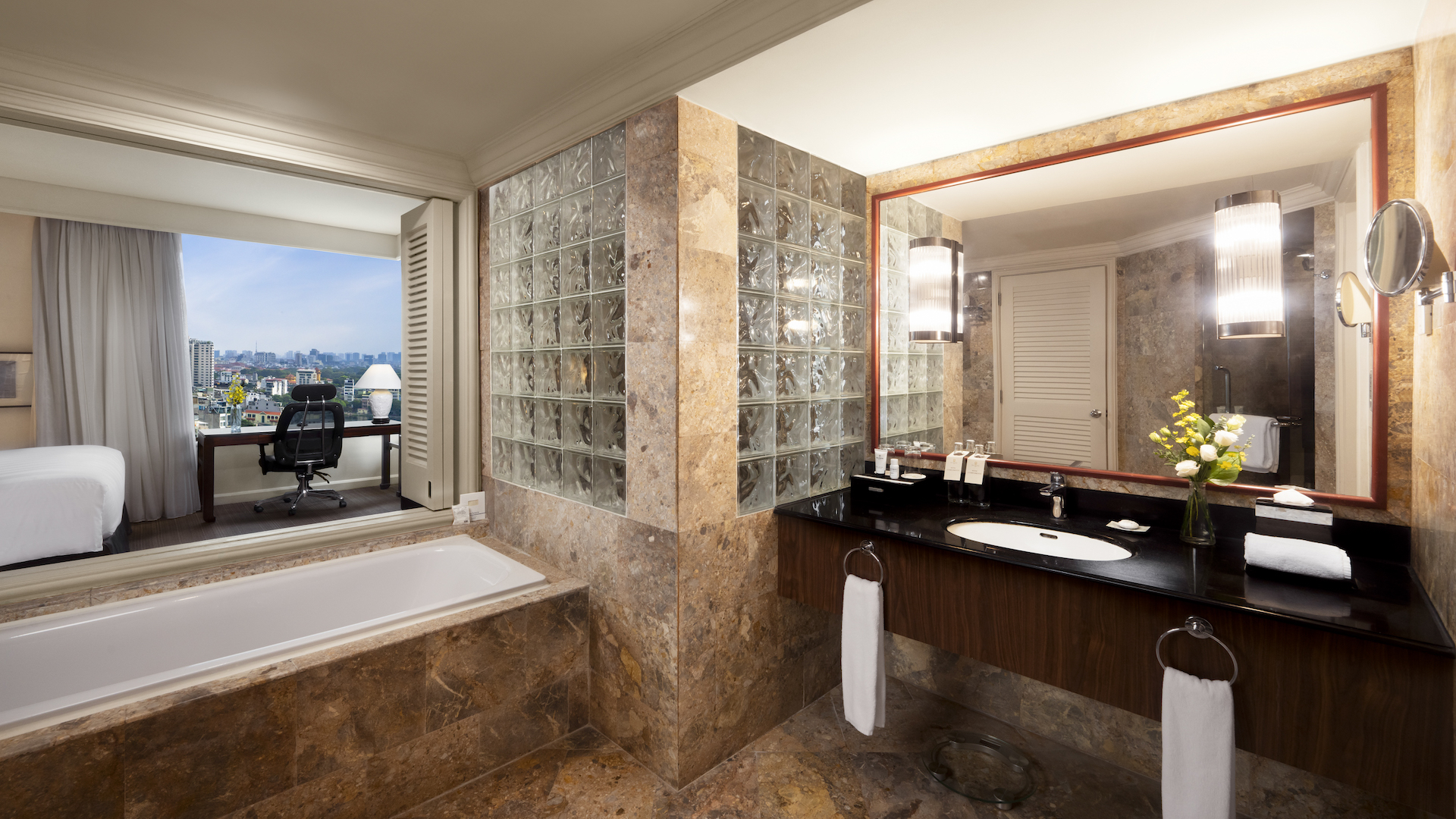 - Deluxe Room — комфортные просторные номера площадью 35 кв.м, с захватывающим видом на город, состоящие из спальни с одной большой двуспальной кроватью King-size или двумя односпальными кроватями Twin, уютно обставленной гостиной зоны, рабочей зоны с письменным столом, роскошной ванной комнаты открытой планировки с ванной и душевой кабиной с тропическим душем.