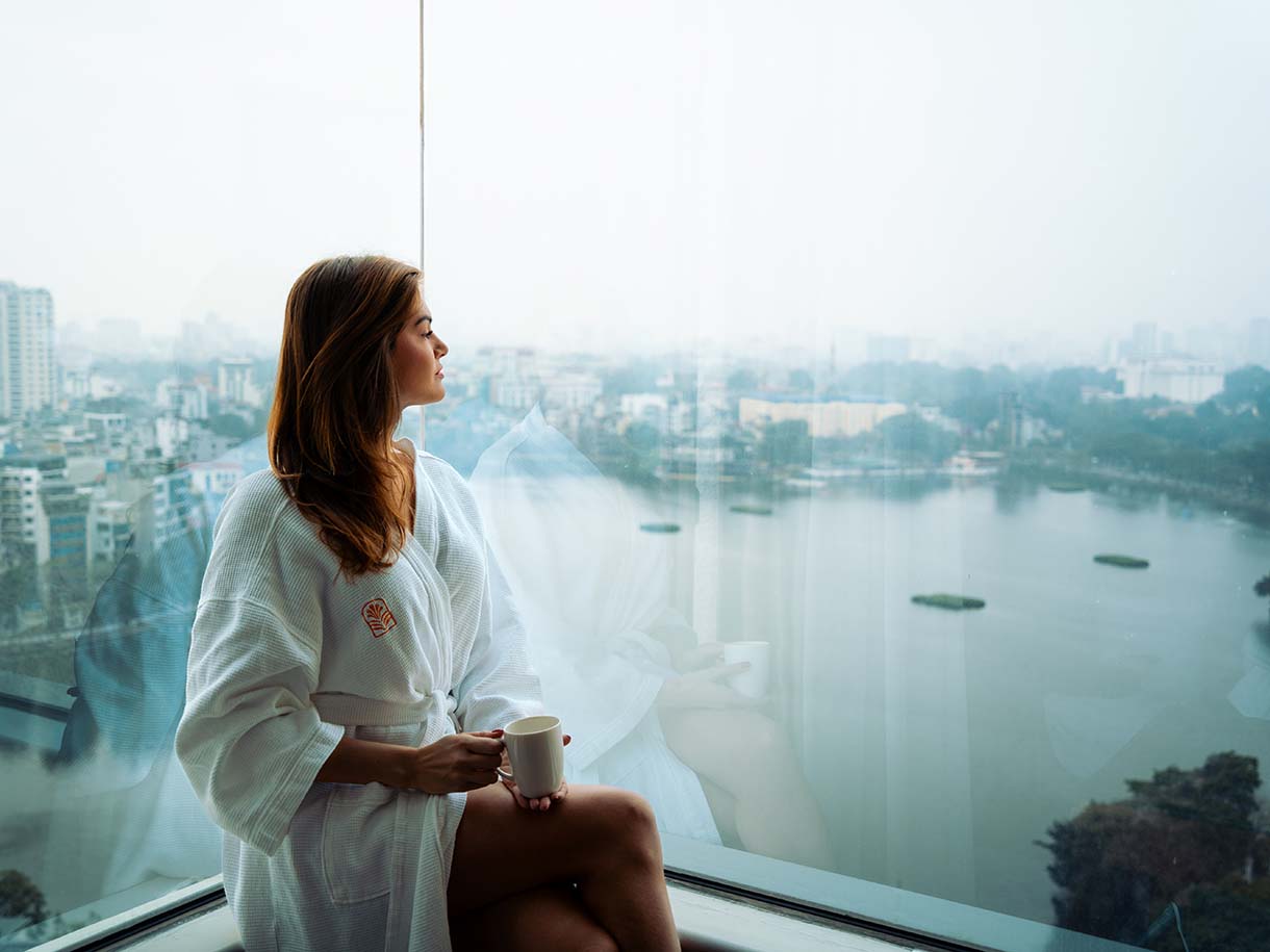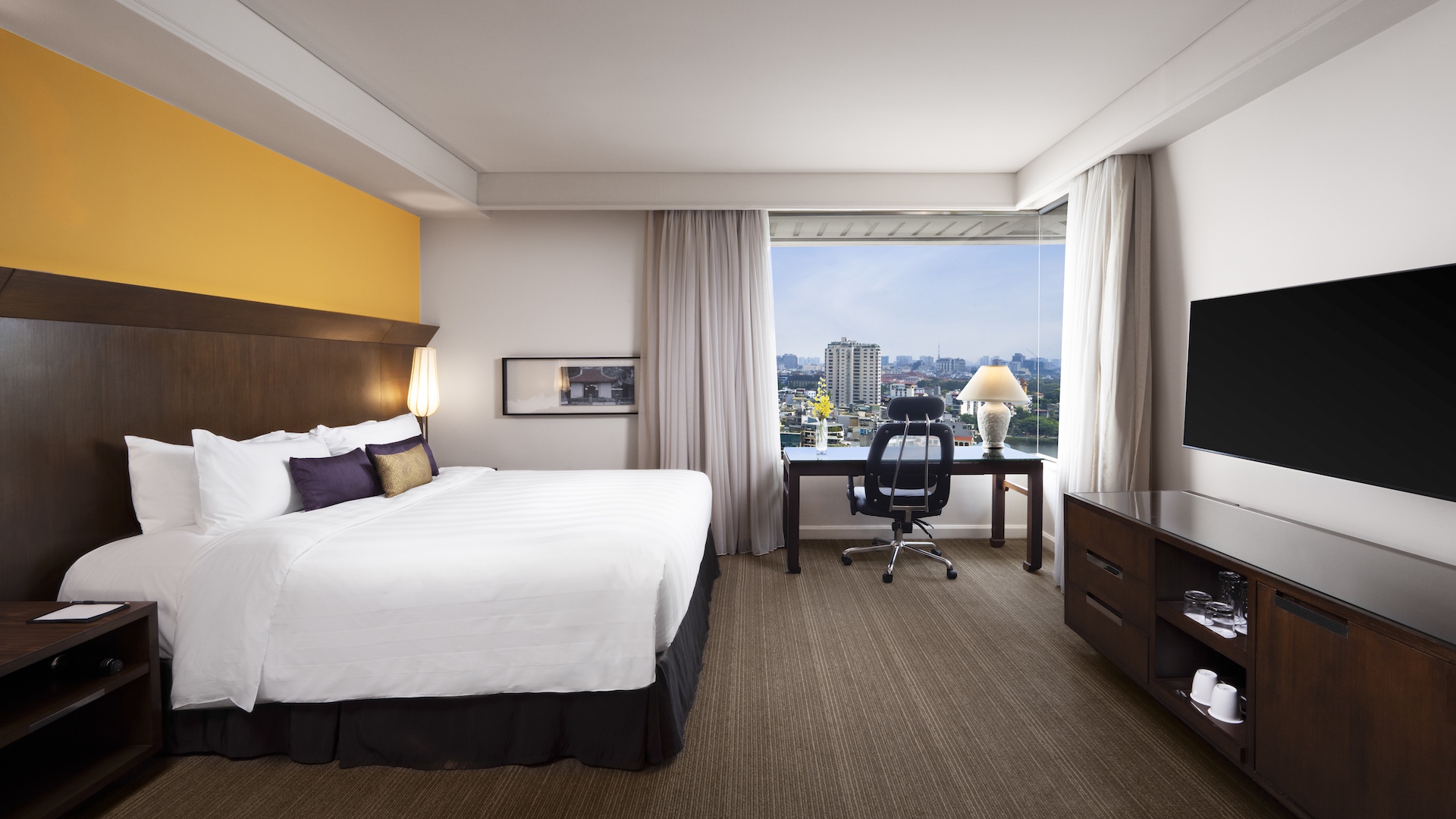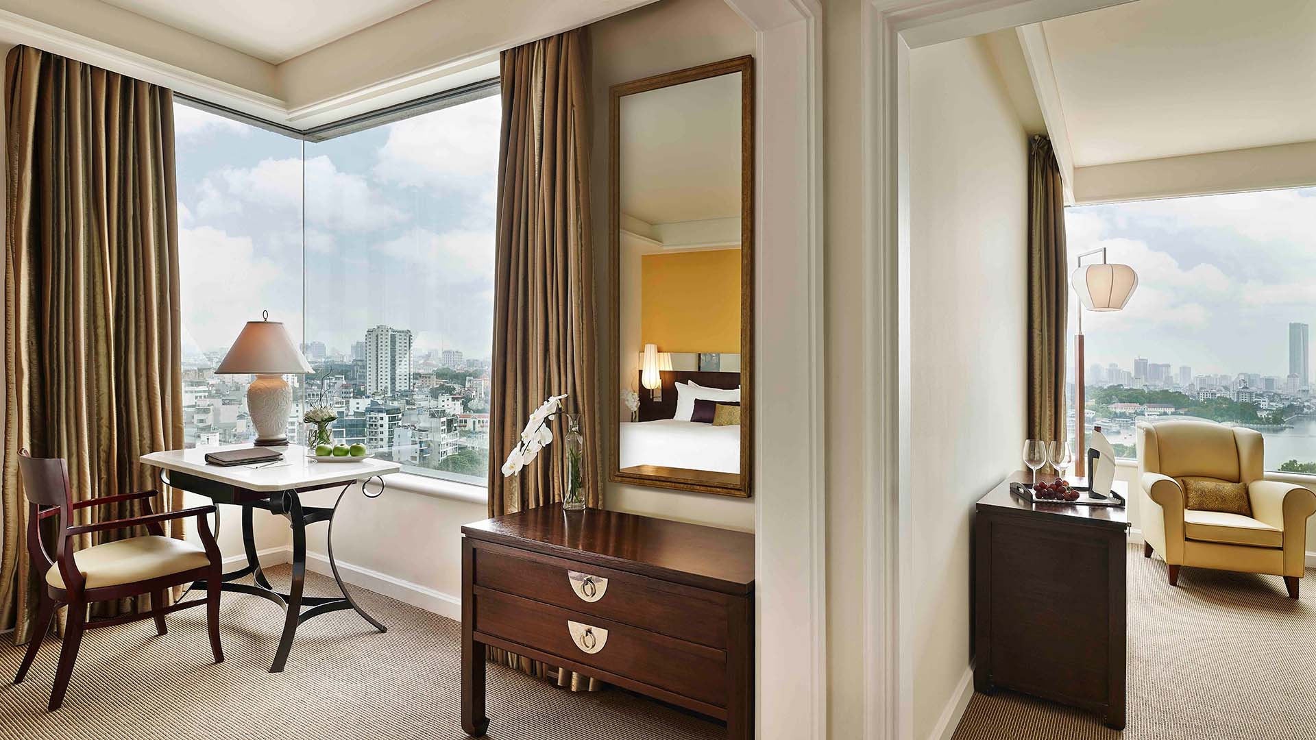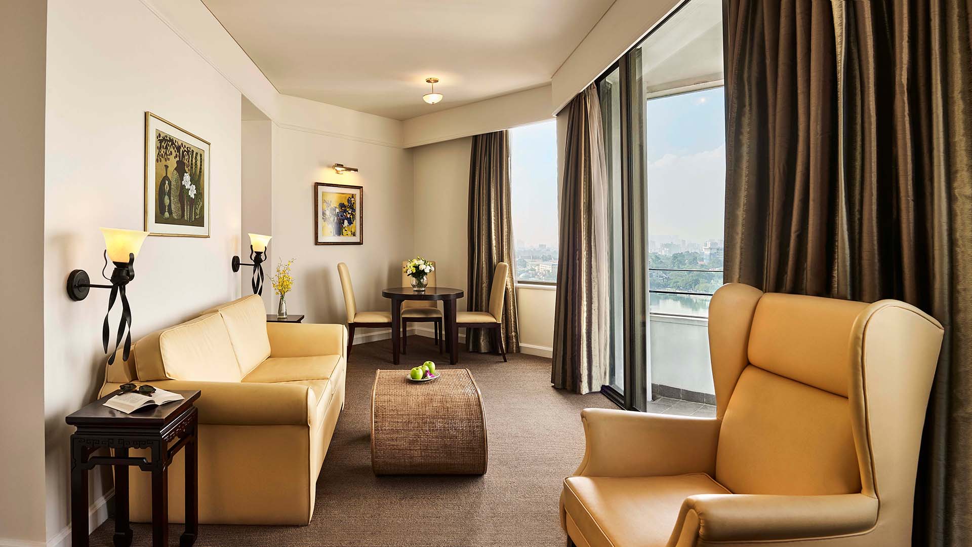 - Deluxe Lakeview Room — просторные номера площадью 35 кв.м, с захватывающим видом на озера West Lake и Truc Bach Lake, состоящие из спальни с одной большой двуспальной кроватью King-size или двумя односпальными кроватями Twin, уютно обставленной гостиной зоны, рабочей зоны с письменным столом, роскошной стильной ванной комнаты открытой планировки с ванной и душевой кабиной с освежающим тропическим душем.