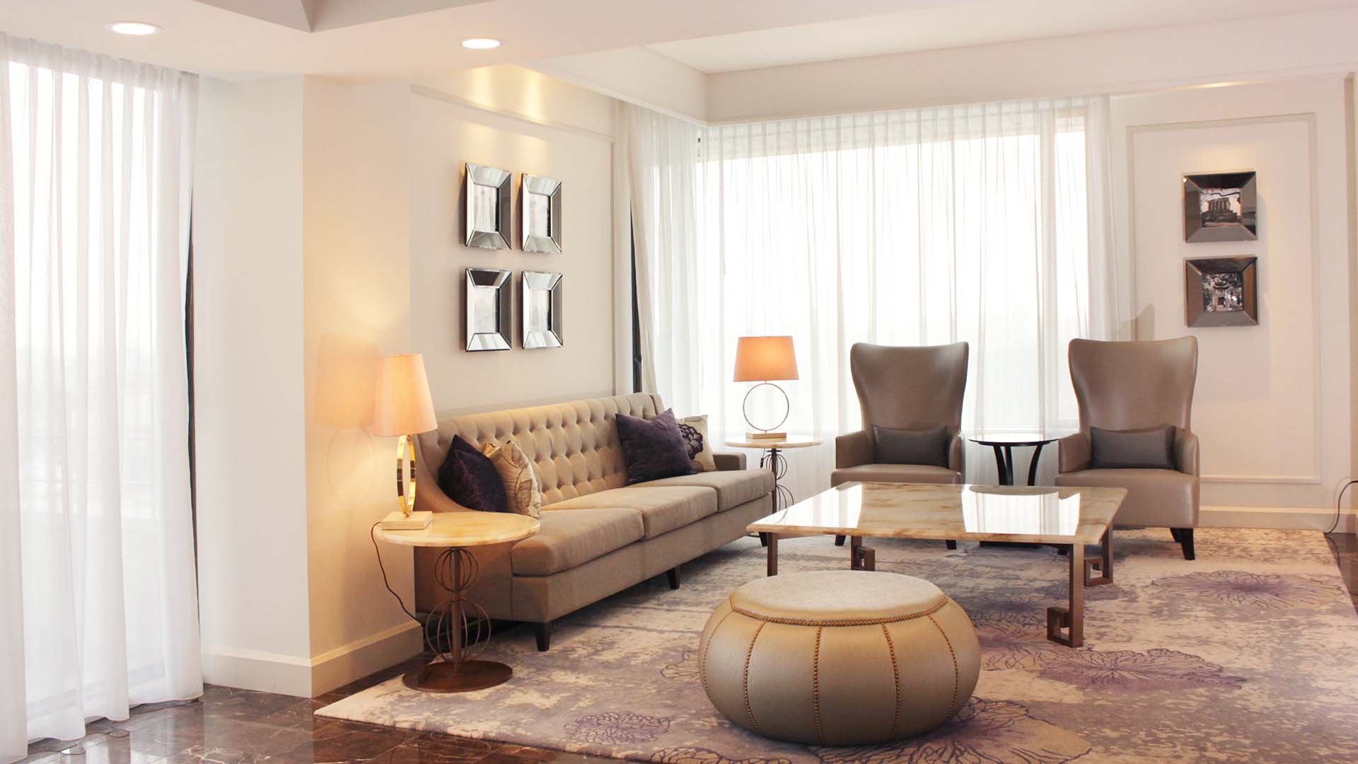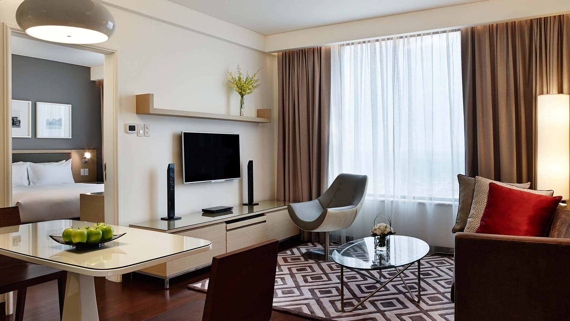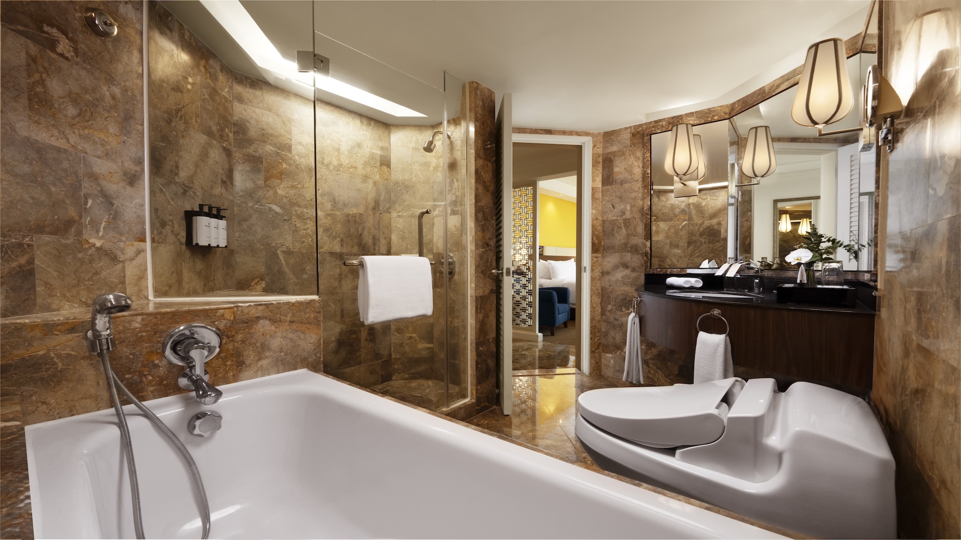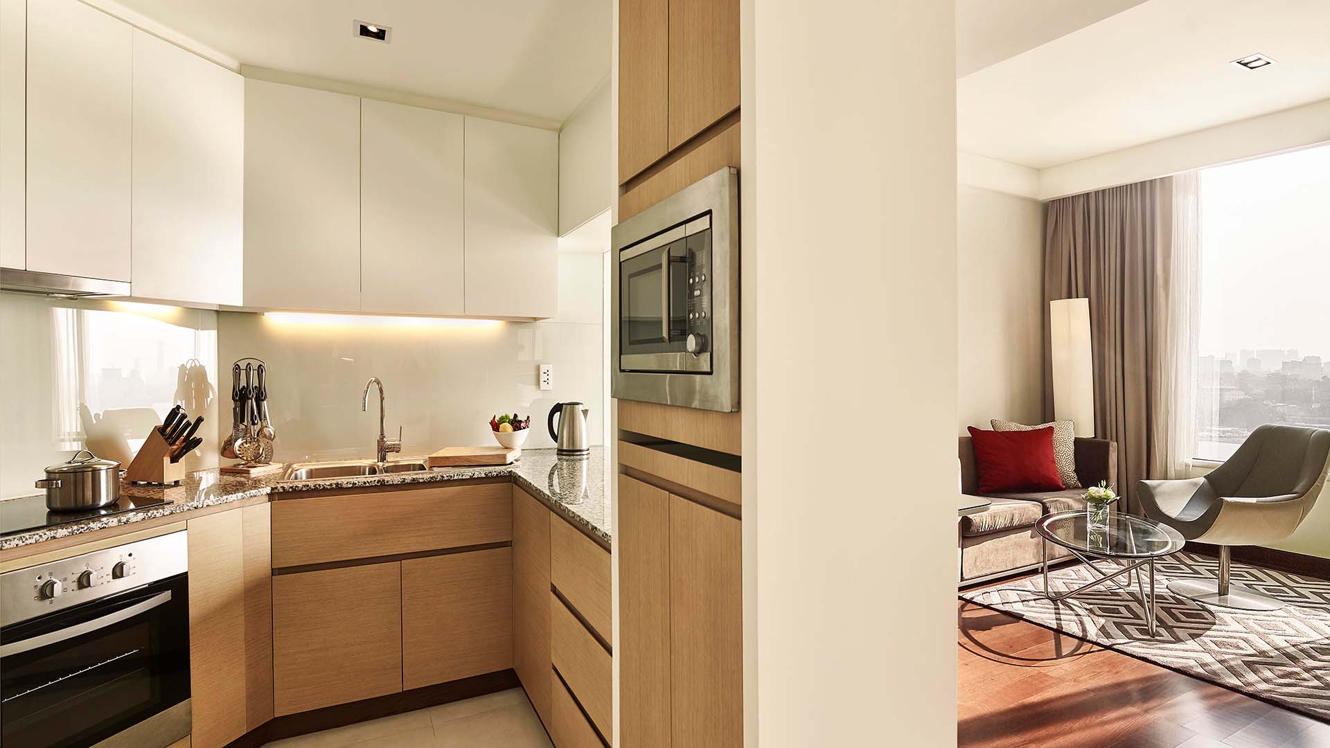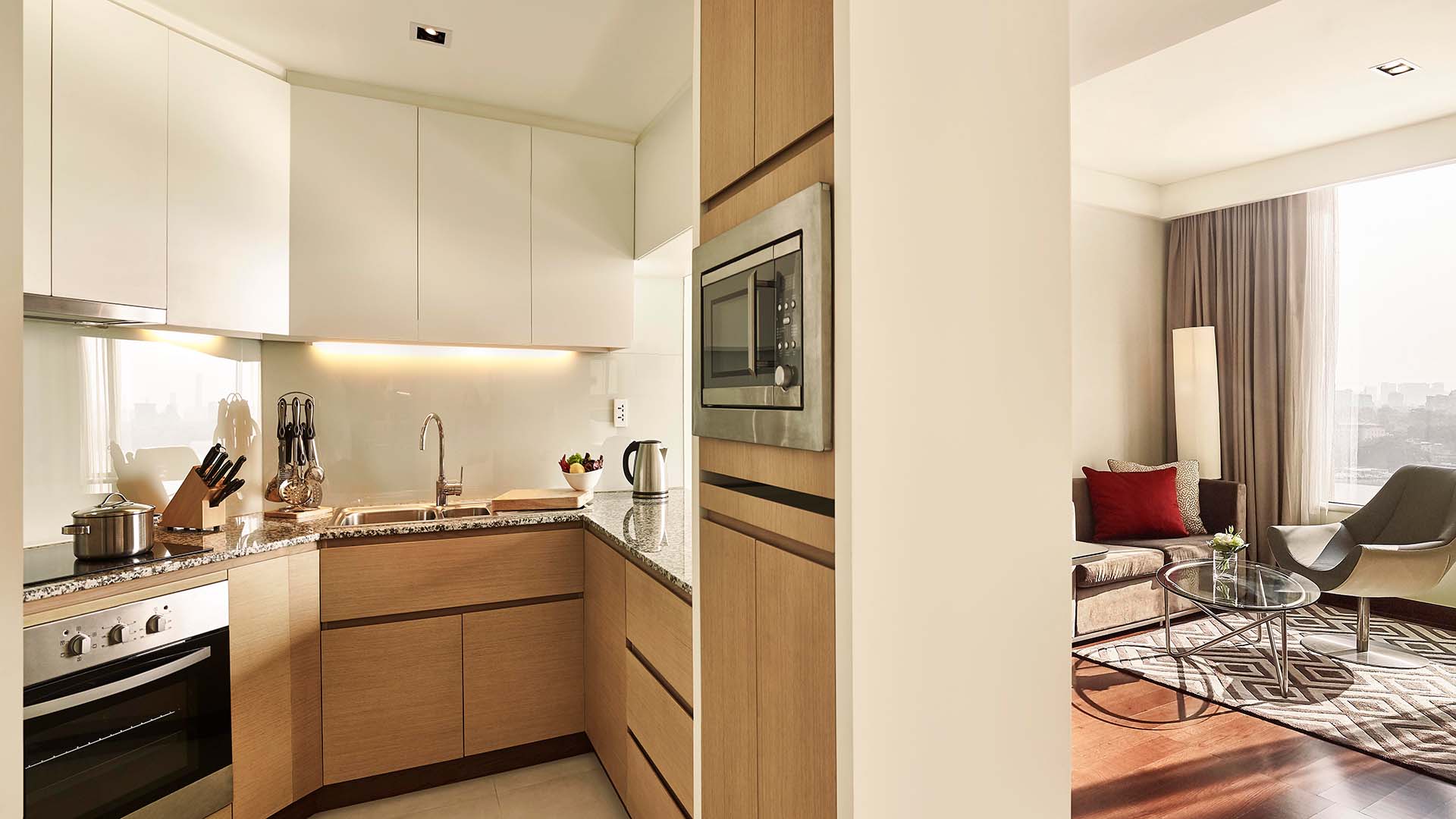 Дополнительно в люксах есть программируемый термостат, домашний кинотеатр с DVD-плеером, стиральная машина и сушилка, утюг и гладильная доска; предоставляется бесплатный онлайн-доступ к широкому выбору газет и журналов; можно воспользоваться общей прачечной со стиральной машиной и сушилкой на каждом этаже. - Two Bedroom Premier Serviced Suite — отличающиеся изысканным дизайном и идеально подходящие для длительного пребывания просторные люксы с обслуживанием площадью 90 кв.м, состоящие из двух спален (две большие двуспальные кровати King-size или одна кровать King-size и двуе отдельные кровати Twin), отдельной гостиной комнаты, столовой зоны с обеденным столом, полностью оборудованной мини-кухни с микроволновой печью, полноразмерным холодильником, индукционной плитой и духовкой, ванной комнаты с глубокой ванной и отдельной душевой кабиной с тропическим душем.