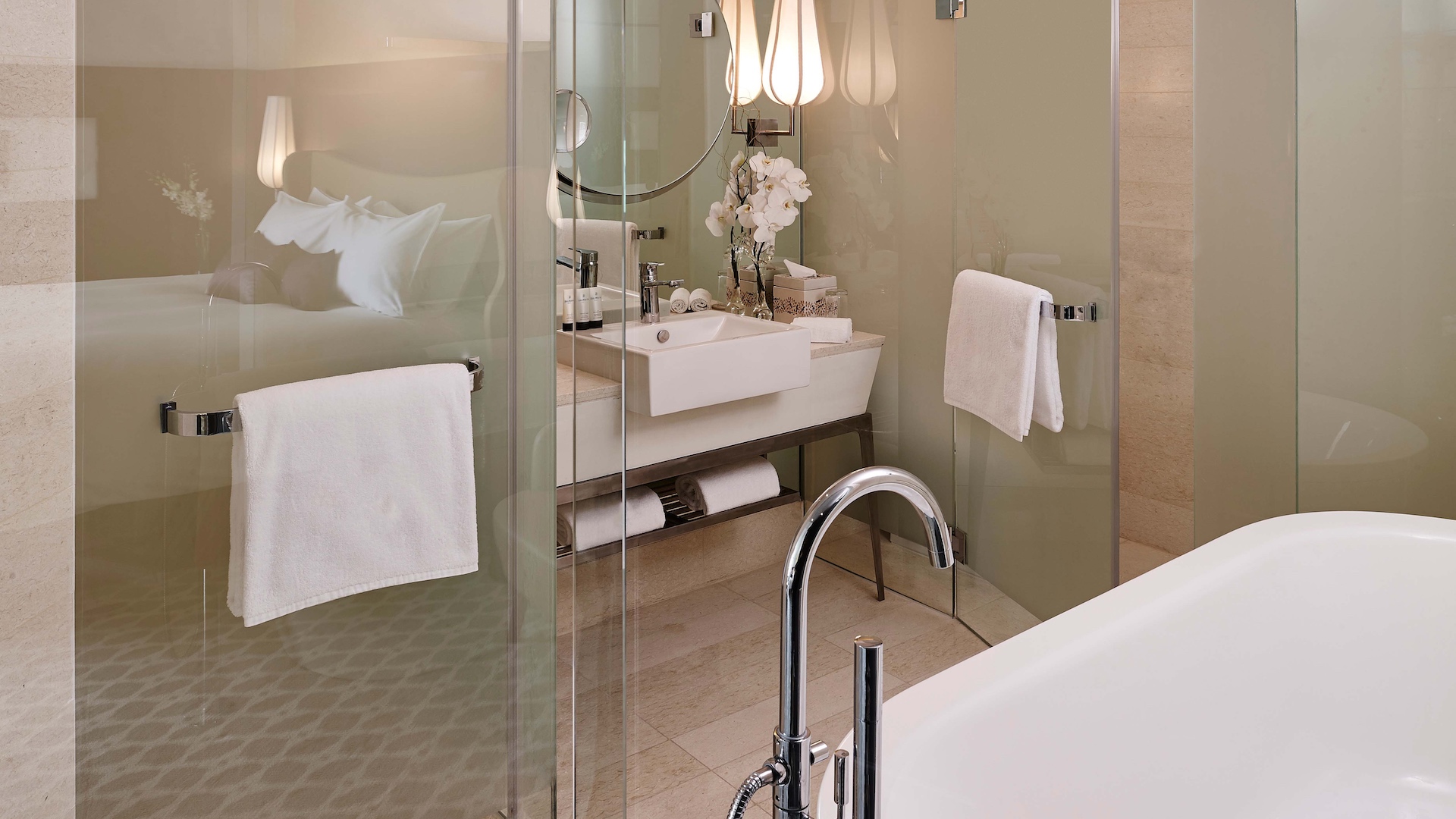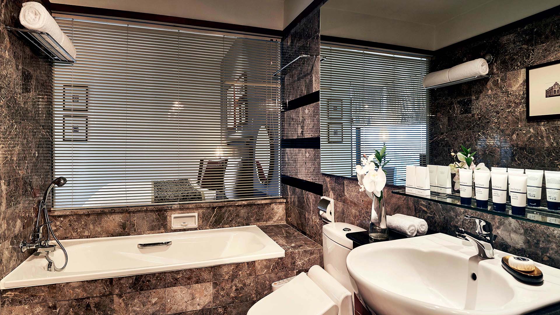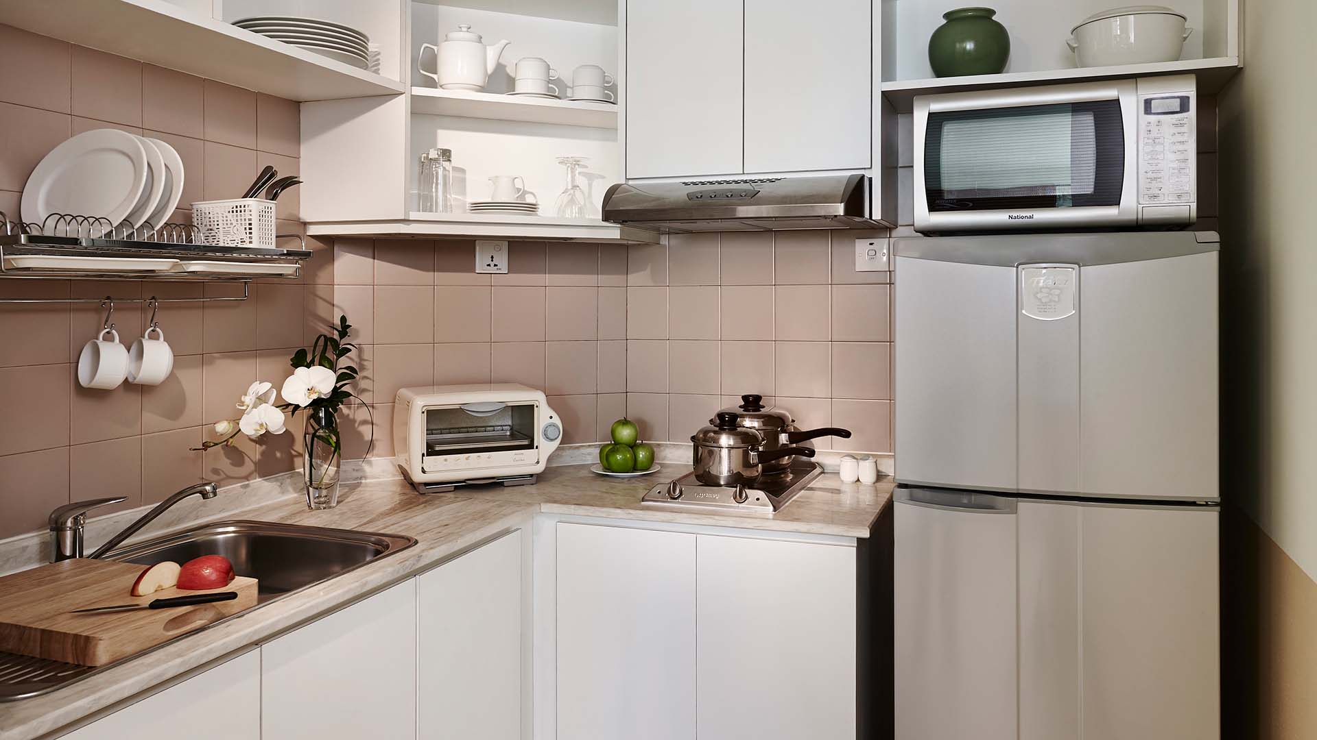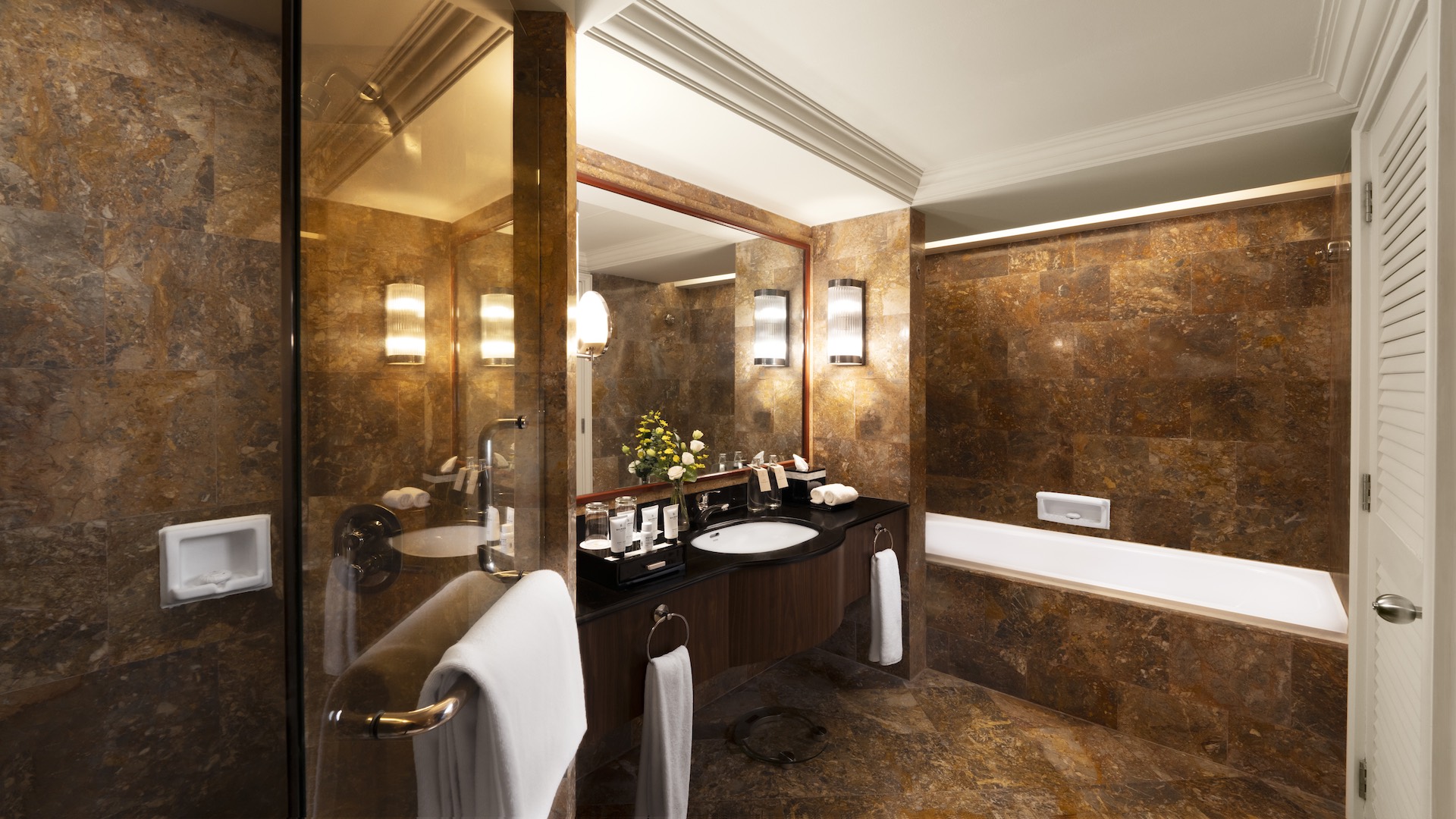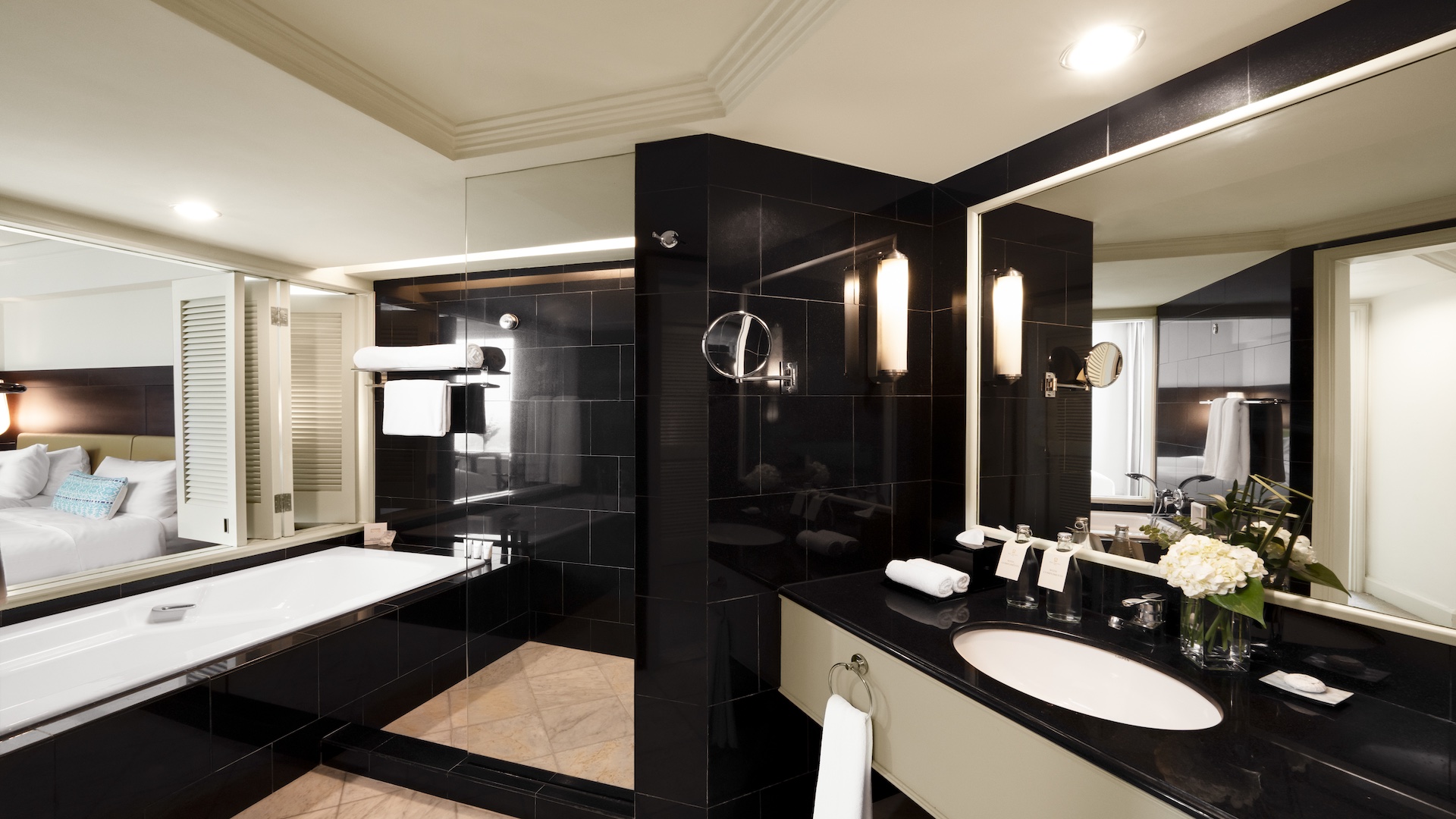Дополнительно в люксах есть программируемый термостат, домашний кинотеатр с DVD-плеером, стиральная машина и сушилка, утюг и гладильная доска; предоставляется бесплатный онлайн-доступ к широкому выбору газет и журналов; можно воспользоваться общей прачечной со стиральной машиной и сушилкой на каждом этаже. - Two Bedroom Premier Serviced Suite — отличающиеся изысканным дизайном и идеально подходящие для длительного пребывания просторные люксы с обслуживанием площадью 90 кв.м, состоящие из двух спален (две большие двуспальные кровати King-size или одна кровать King-size и двуе отдельные кровати Twin), отдельной гостиной комнаты, столовой зоны с обеденным столом, полностью оборудованной мини-кухни с микроволновой печью, полноразмерным холодильником, индукционной плитой и духовкой, ванной комнаты с глубокой ванной и отдельной душевой кабиной с тропическим душем.