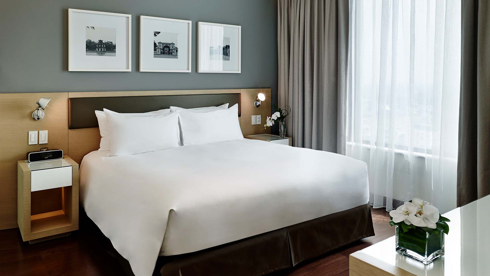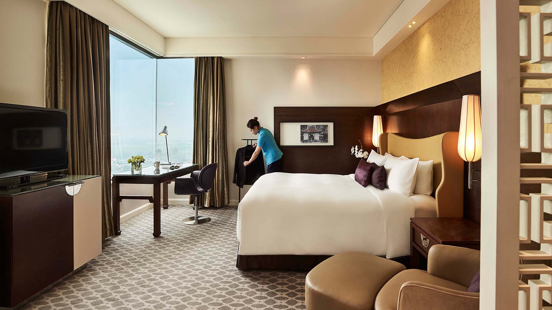 Дополнительно в люксах есть программируемый термостат, DVD-плеер, утюг и гладильная доска; предоставляется бесплатный онлайн-доступ к широкому выбору газет и журналов; можно воспользоваться общей прачечной со стиральной машиной и сушилкой на каждом этаже. - One Bedroom Executive Serviced Suite — расположенные на верхних этажах отеля и идеально подходящие для длительного пребывания уютные и элегантные люксы с обслуживанием площадью 60 кв.м, с потрясающим видом на городской пейзаж и озеро West Lake, состоящие из спальни с одной большой двуспальной кроватью King-size, отдельной гостиной комнаты, столовой зоны с обеденным столом, полностью оборудованной мини-кухни с микроволновой печью, полноразмерным холодильником, индукционной плитой и духовкой, ванной комнаты с глубокой расслабляющей ванной и отдельной душевой кабиной с тропическим душем.