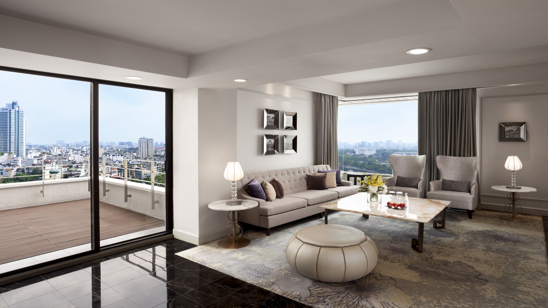 Дополнительно в люксах есть программируемый термостат, домашний кинотеатр с DVD-плеером, стиральная машина и сушилка, утюг и гладильная доска; предоставляется бесплатный онлайн-доступ к широкому выбору газет и журналов; можно воспользоваться общей прачечной со стиральной машиной и сушилкой на каждом этаже. - Two Bedroom Executive Serviced Suite — роскошный просторный представительский люкс обслуживанием площадью 90 кв.м, с прекрасным видом на городской пейзаж и озеро West Lake, состоящий из двух спален (две большие двуспальные кровати King-size или одна кровать King-size и двуе отдельные кровати Twin), отдельной гостиной комнаты, столовой зоны с обеденным столом, полностью оборудованной мини-кухни с микроволновой печью, полноразмерным холодильником, индукционной плитой и духовкой, ванной комнаты с глубокой ванной и отдельной душевой кабиной с тропическим душем.