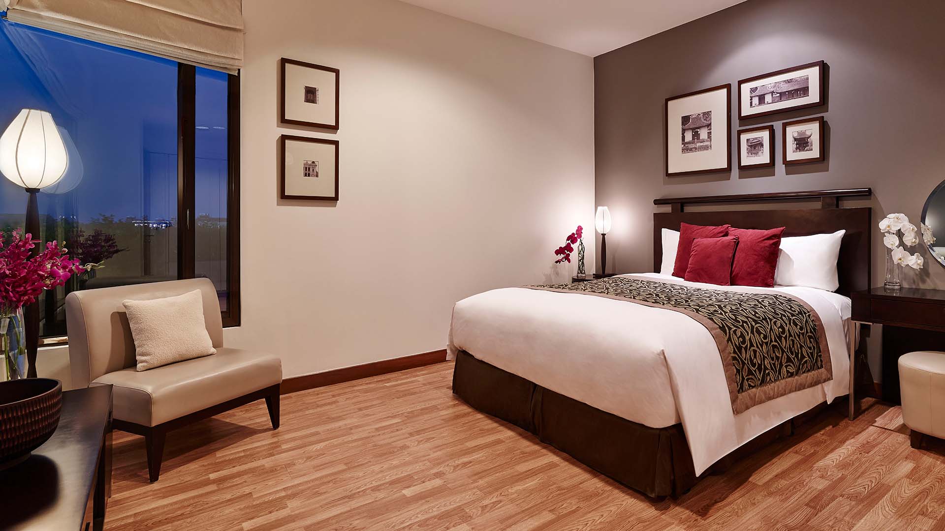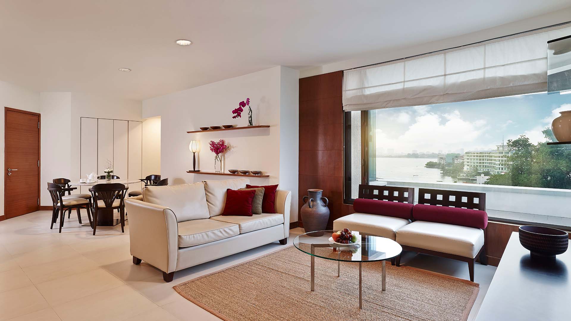 Дополнительно в люксах есть программируемый термостат, DVD-плеер, утюг и гладильная доска; предоставляется бесплатный онлайн-доступ к широкому выбору газет и журналов; можно воспользоваться общей прачечной со стиральной машиной и сушилкой на каждом этаже. - One Bedroom Premier Serviced Suite — идеально подходящие для длительного пребывания уютные и элегантные люксы с обслуживанием площадью 60 кв.м, с завораживающим видом на озеро West Lake, состоящие из спальни с одной большой двуспальной кроватью King-size, отдельной гостиной комнаты, столовой зоны с обеденным столом, полностью оборудованной мини-кухни с микроволновой печью, полноразмерным холодильником, индукционной плитой и духовкой, ванной комнаты с глубокой ванной и отдельной душевой кабиной с тропическим душем.