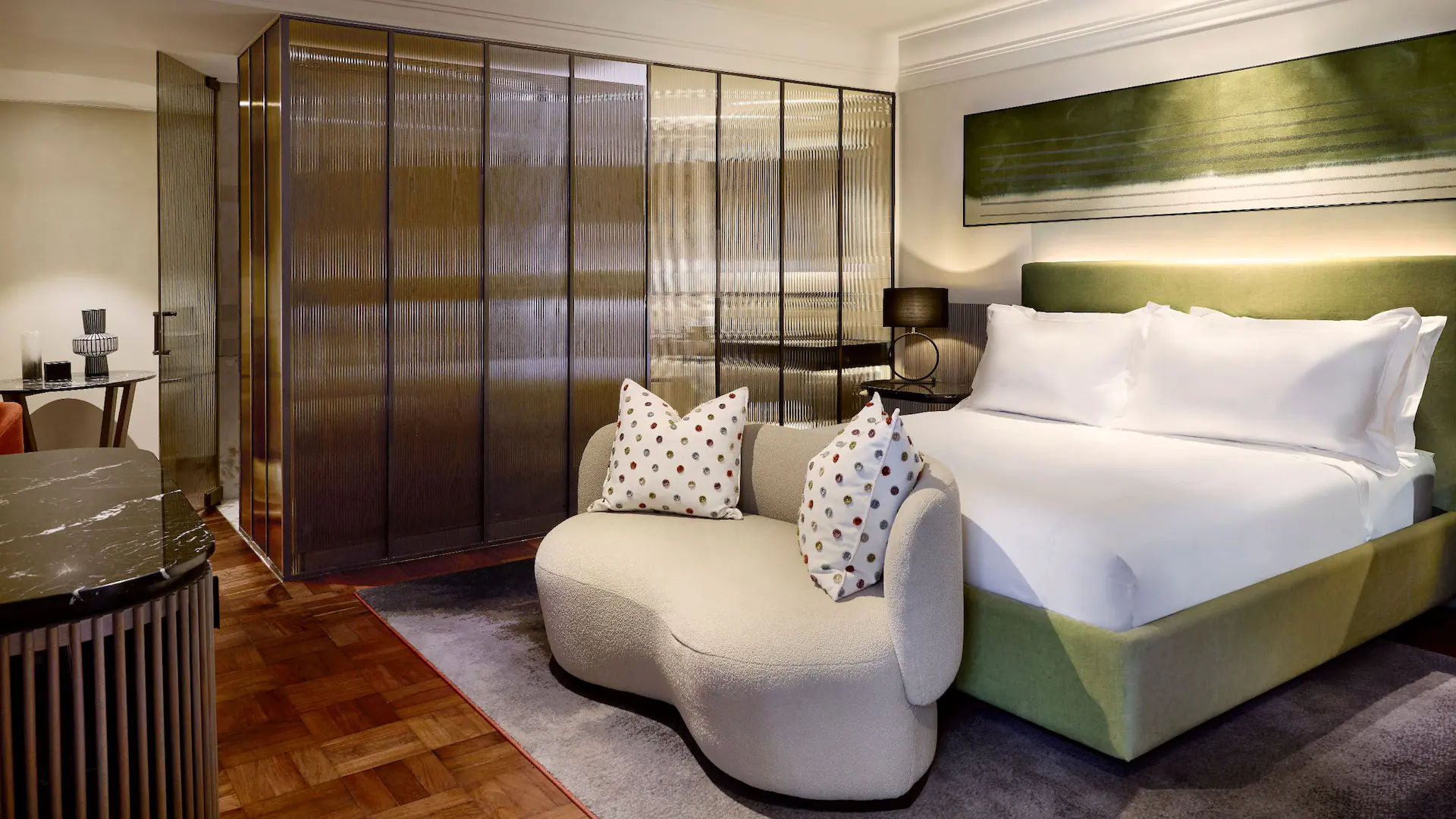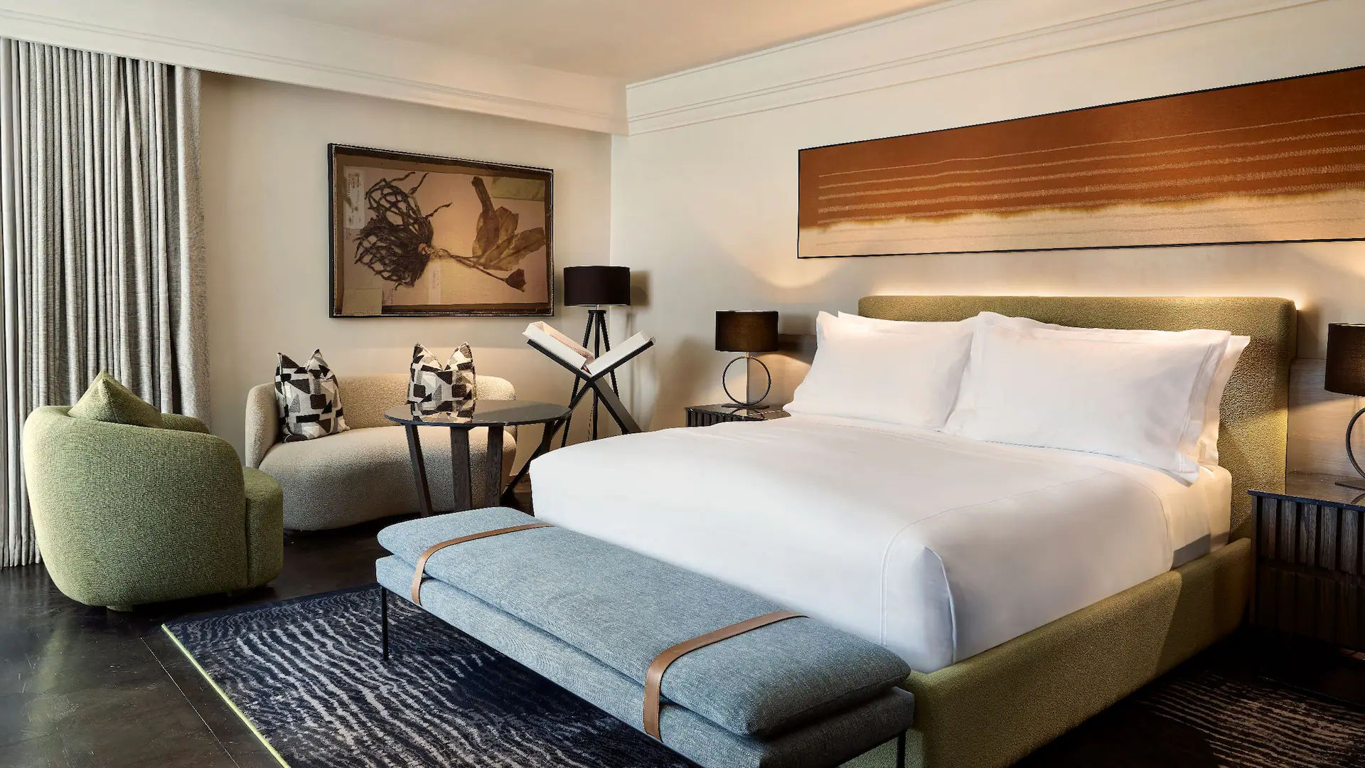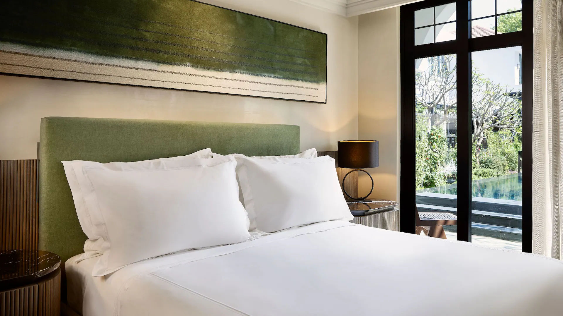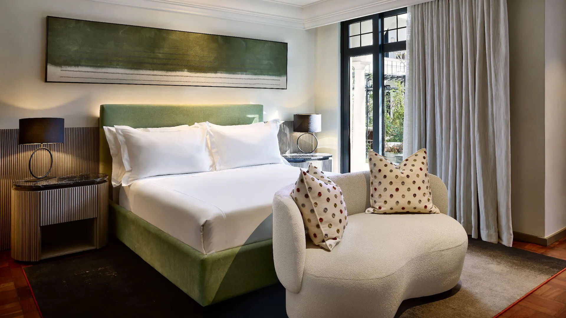 - 1 King Bed Room — отличающиеся элегантным декором и спокойной атмосферой просторные номера площадью 34 кв.м, состоящие из спальни с одной двуспальной кроватью King Bed, уютно обставленной гостиной зоны, рабочей зоны с письменным столом, современной ванной комнаты с ванной, отдельной душевой кабиной открытой планировки и двумя раковинами с гранитной столешницей (для него и для нее), частного патио.