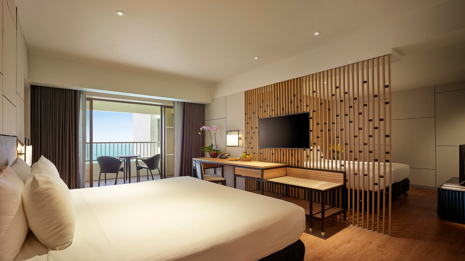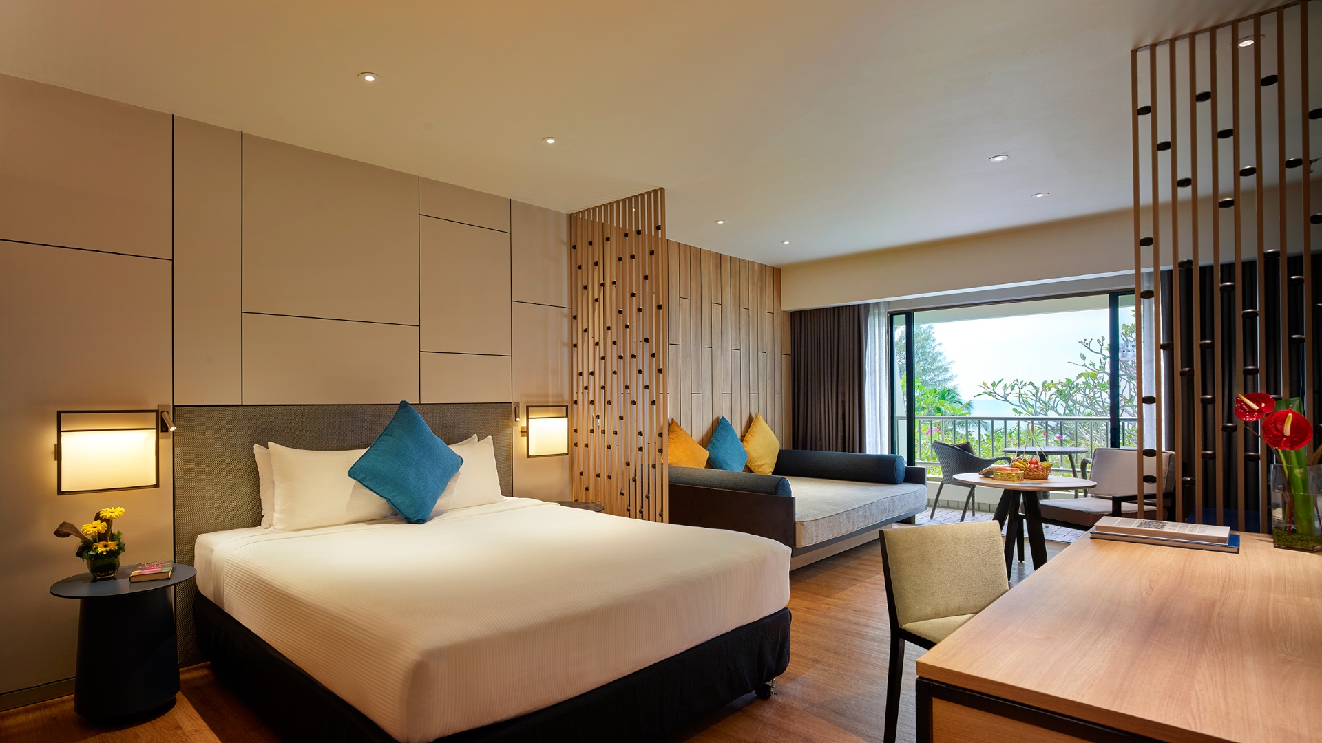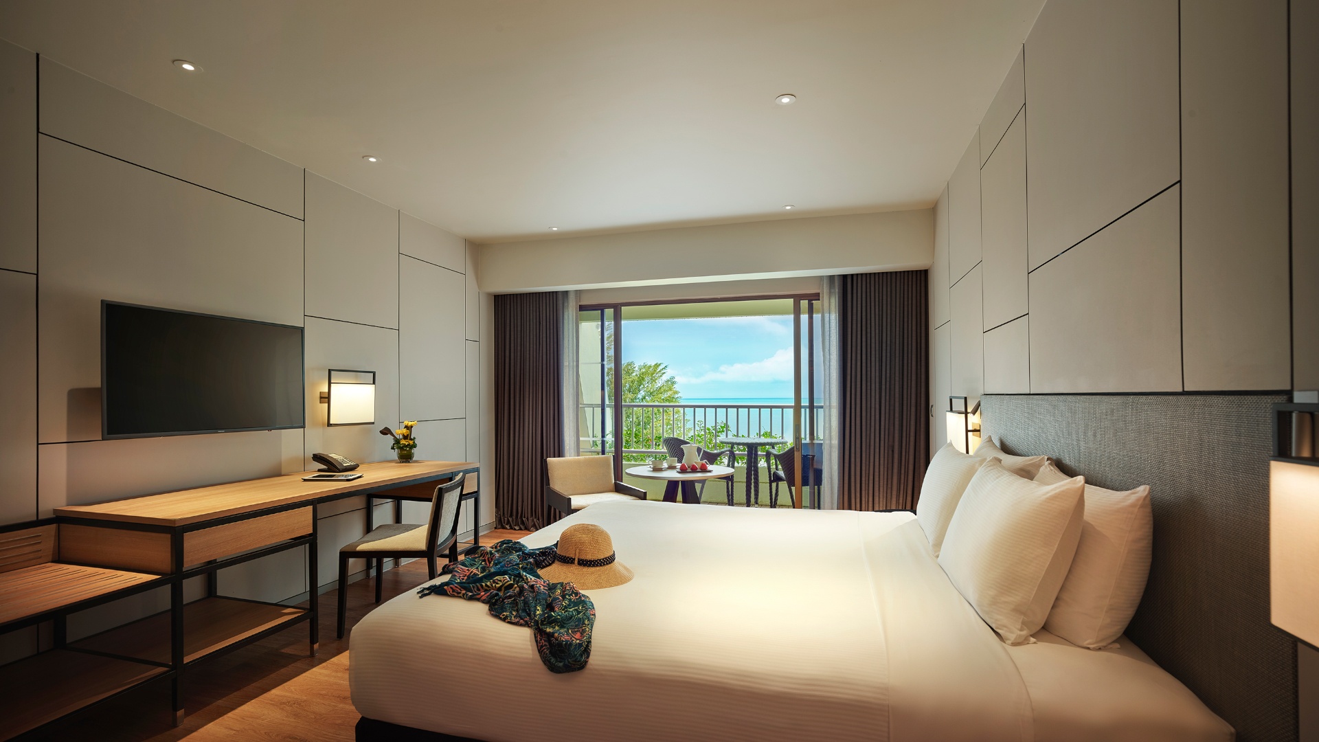 - Premier Seaview Room — элегантные номера площадью 34 кв.м, с потрясающим видом на море и сад, состоящие из спальни с одной двуспальной кроватью King-size или двумя односпальными кроватями Twin, уютно обставленной гостиной зоны, рабочей зоны с письменным столом, большой ванной комнаты с душевой кабиной, раковиной и биде, частного меблированного балкона.