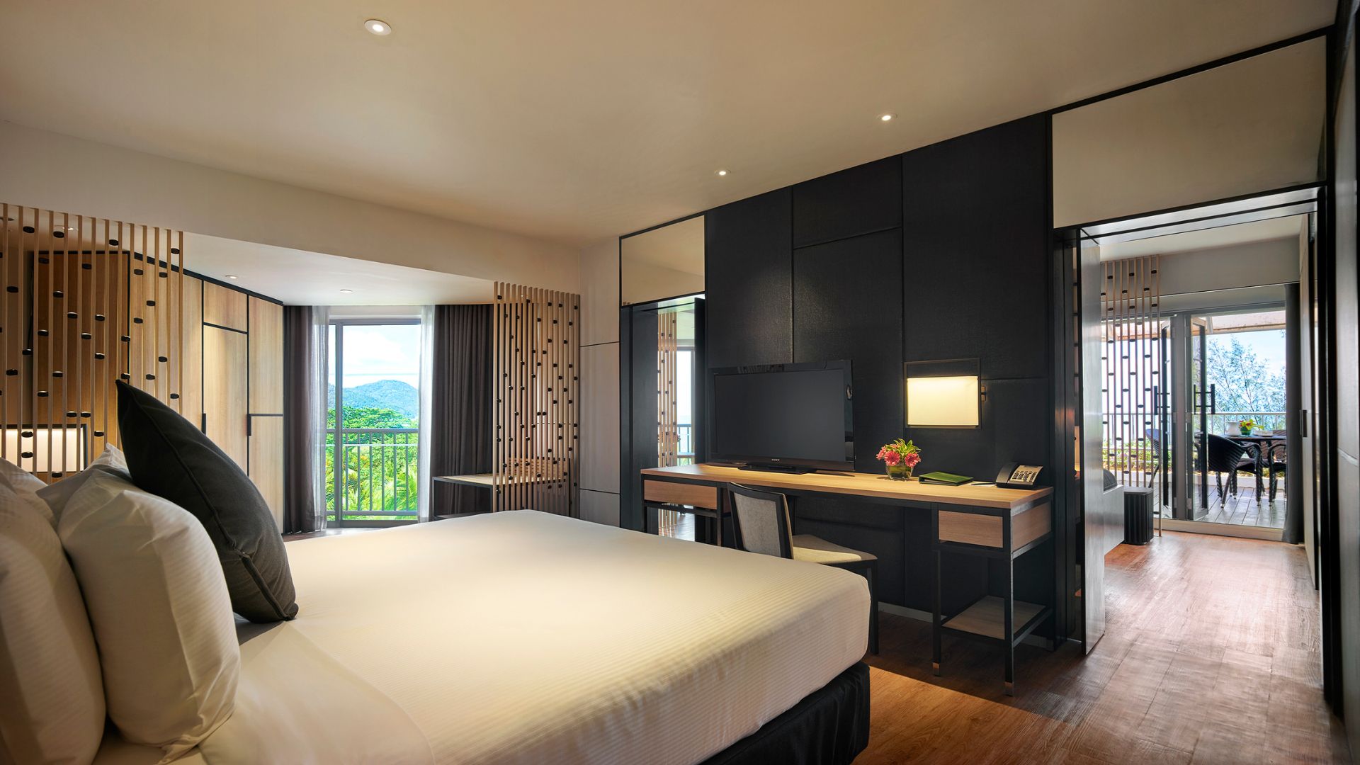 - Deluxe Sea-Facing Room — просторные и стильные номера площадью 33 кв.м, с живописным видом на пышную зелень и частичным видом на море, состоящие из спальни с одной двуспальной кроватью King-size или двумя односпальными кроватями Twin, уютно обставленной гостиной зоны с кушеткой для отдыха (в некоторых номерах), рабочей зоны с письменным столом, большой ванной комнаты с душевой кабиной, раковиной и биде.