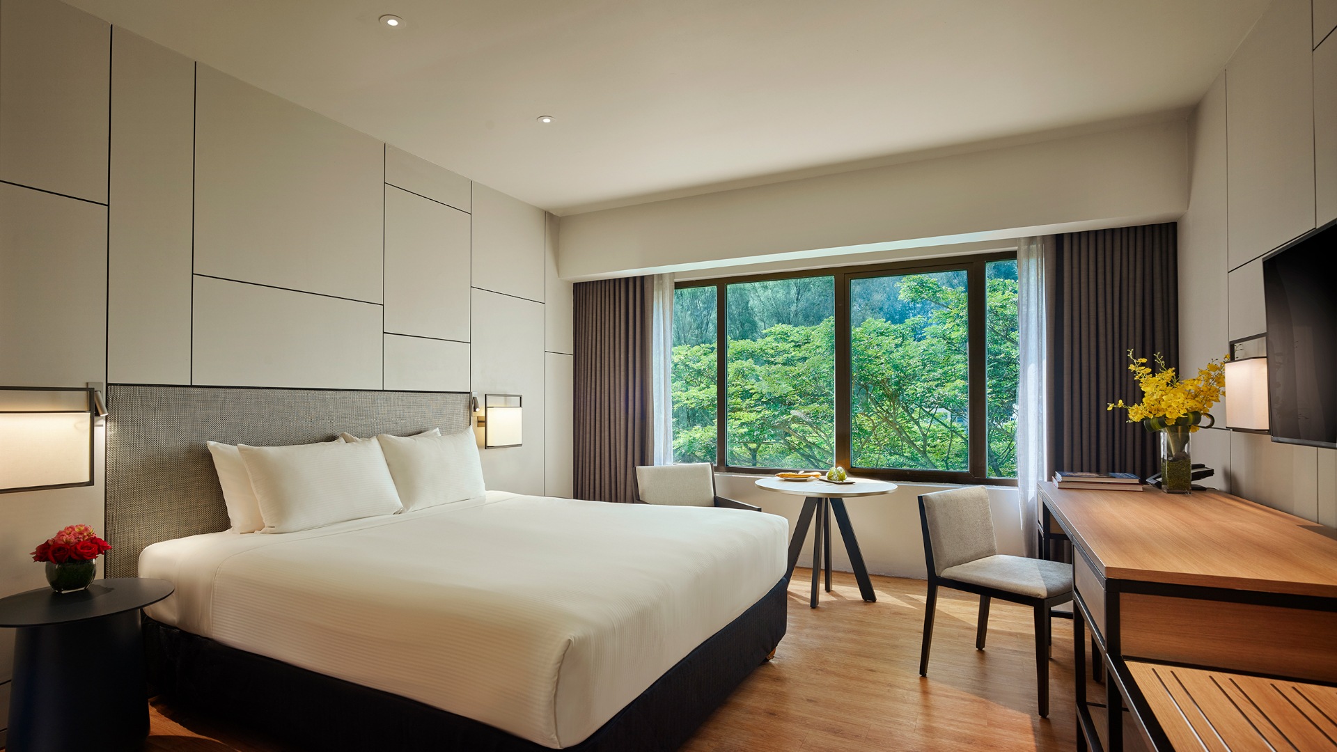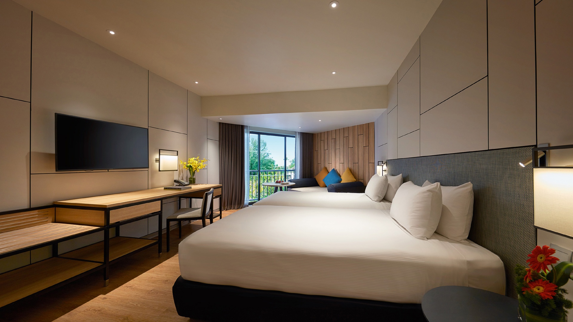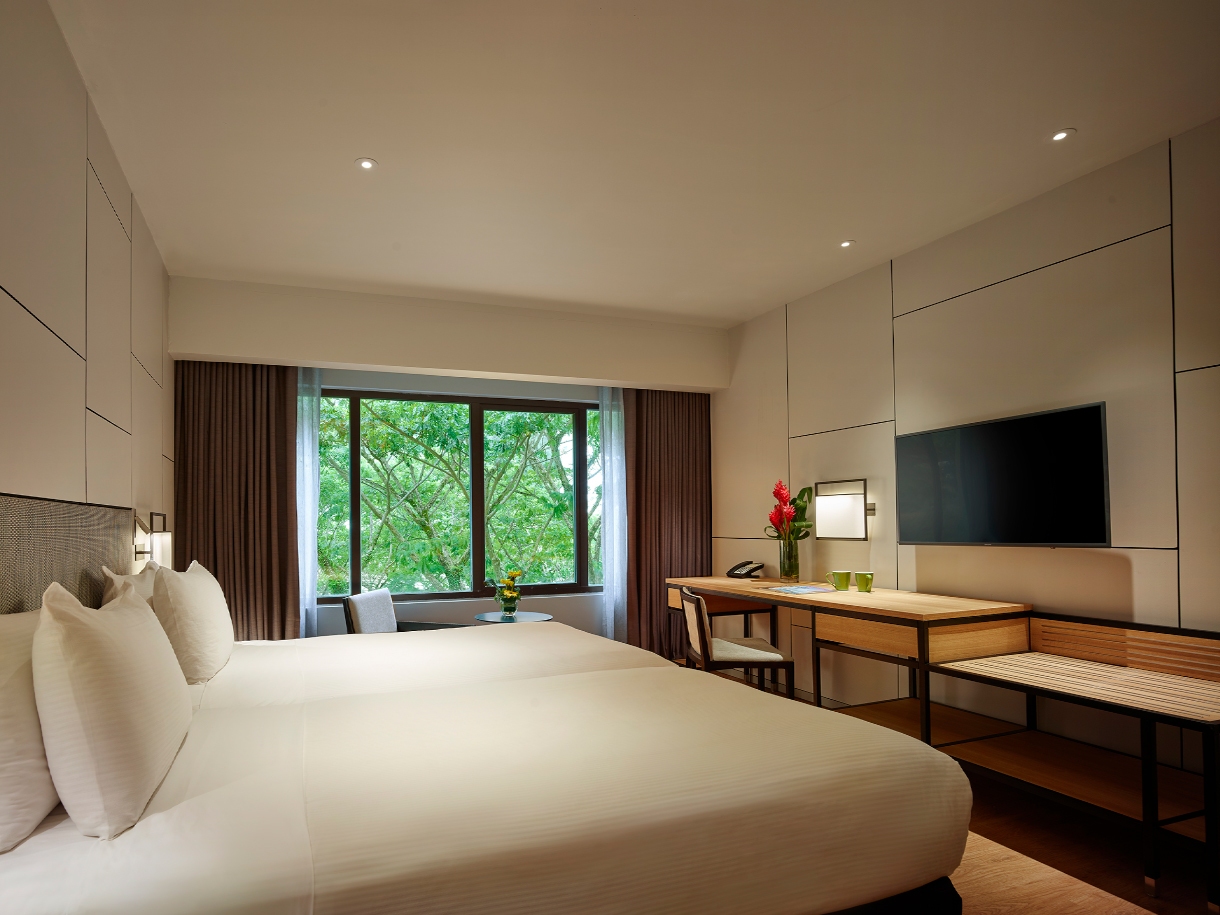 - Deluxe Room — наполненные естественным светом просторные и стильно оформленные номера площадью 33 кв.м, с ярким декором и видом на зеленые окрестности, состоящие из спальни с одной двуспальной кроватью King Bed или двумя односпальными кроватями Twin, уютно обставленной гостиной зоны с кушеткой для отдыха (в некоторых номерах), рабочей зоны с письменным столом, большой ванной комнаты с душевой кабиной, раковиной и биде.