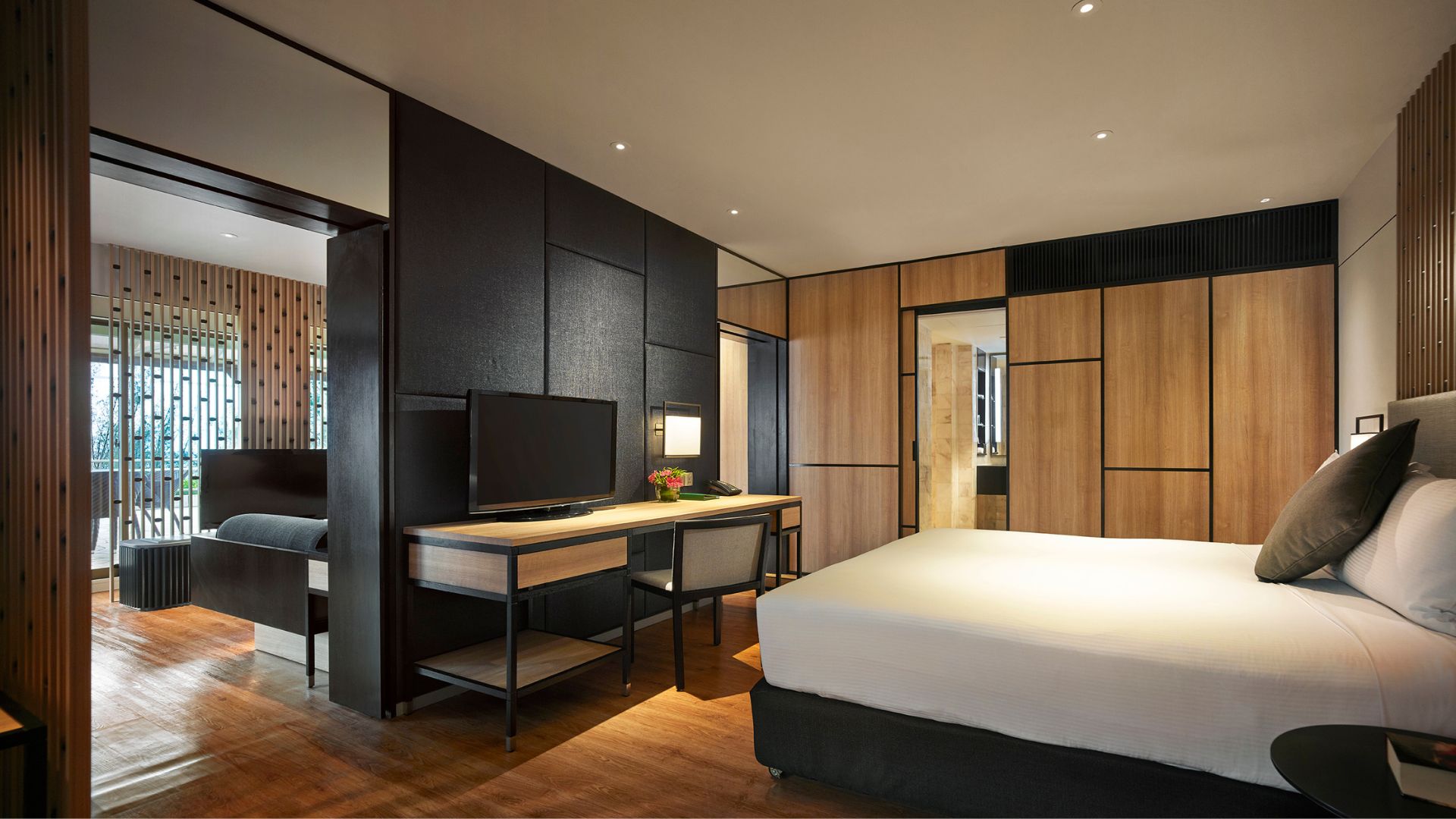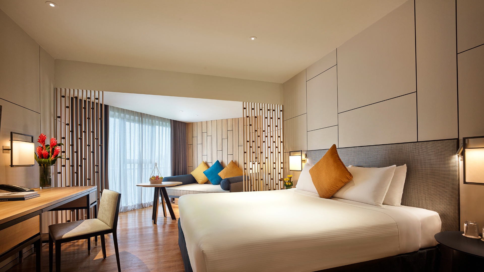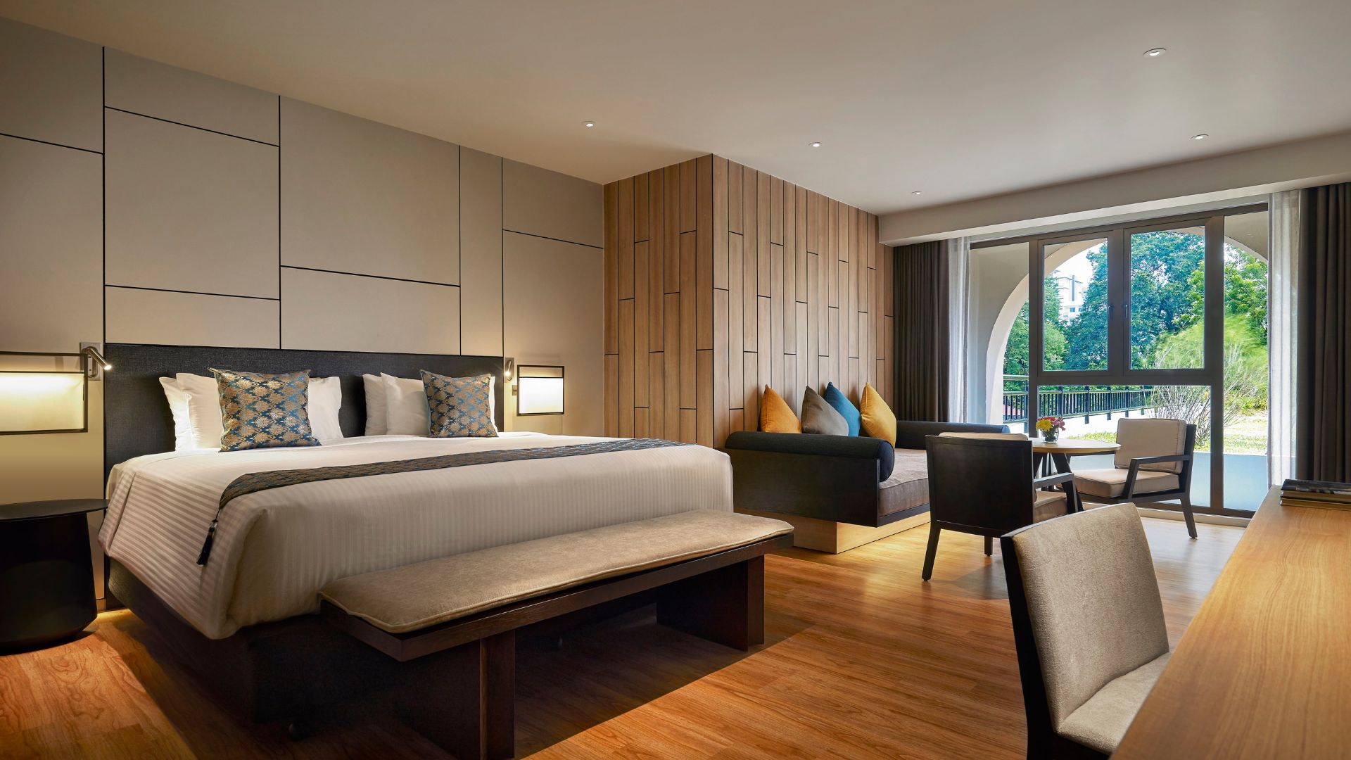 - Deluxe Room — наполненные естественным светом просторные и стильно оформленные номера площадью 33 кв.м, с ярким декором и видом на зеленые окрестности, состоящие из спальни с одной двуспальной кроватью King Bed или двумя односпальными кроватями Twin, уютно обставленной гостиной зоны с кушеткой для отдыха (в некоторых номерах), рабочей зоны с письменным столом, большой ванной комнаты с душевой кабиной, раковиной и биде.