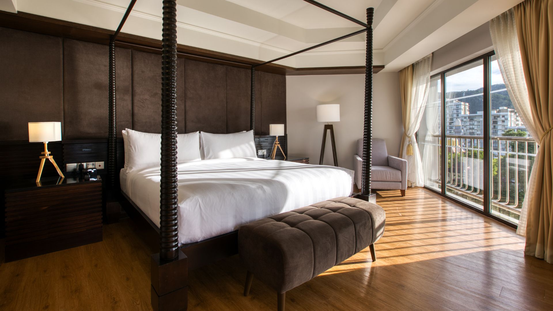 Дополнительно в люксе есть два кондиционера, кофемашина, весы, набор для бритья. - Pulau Pinang Suite — предлагающий полное уединение и эксклюзивность, один из самых больших люксов площадью 177 кв.м, с потрясающим панорамным видом на Малаккский пролив, состоящий из спальни с одной двуспальной кроватью King-size, отдельной гостиной комнаты с кушеткой, столовой с обеденным столом, рабочей зоны с письменным столом, роскошной ванной комнаты с ванной, душевой кабиной с тропическим душем, раковиной и биде, частной меблированной солнечной террасы.