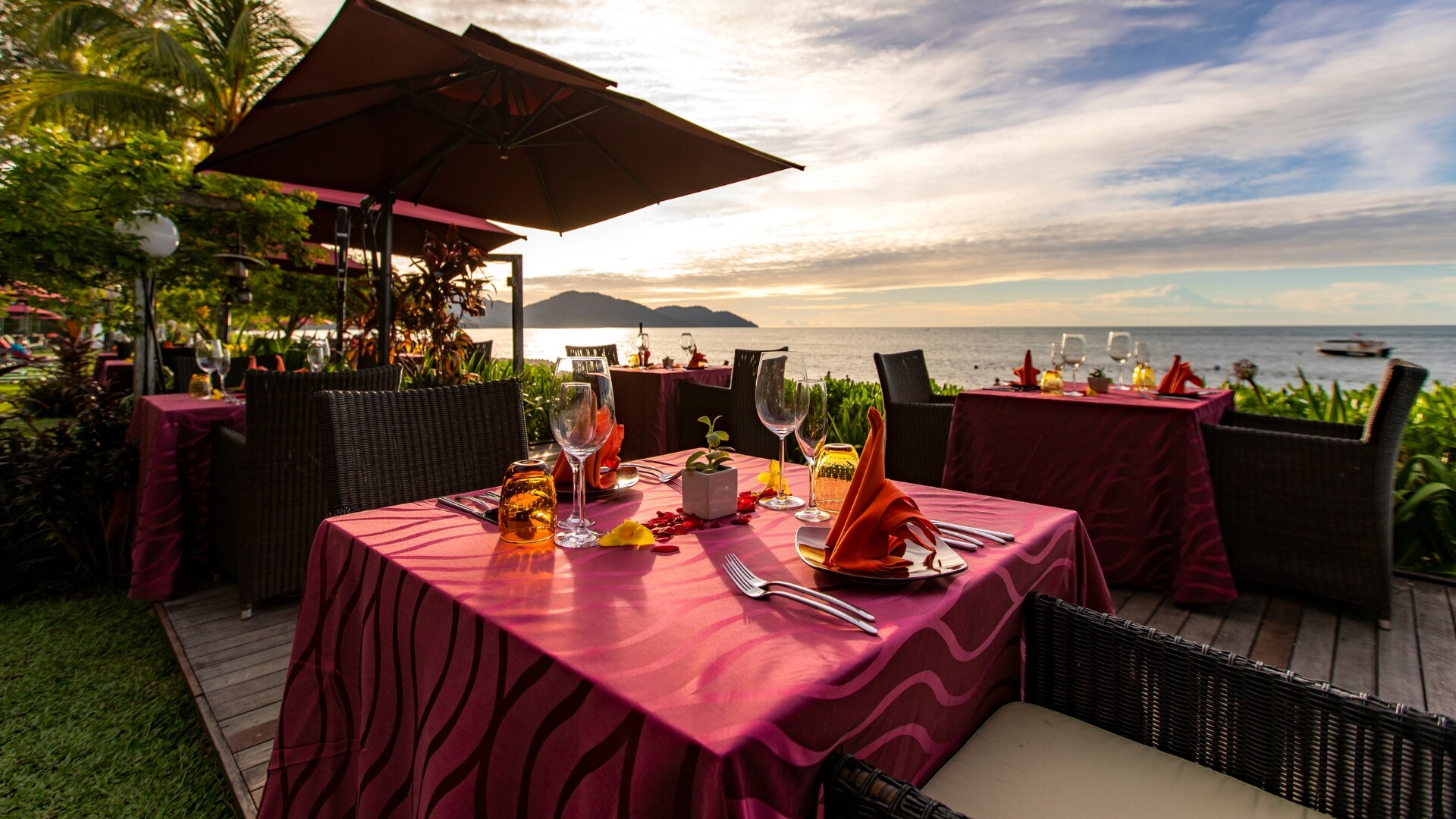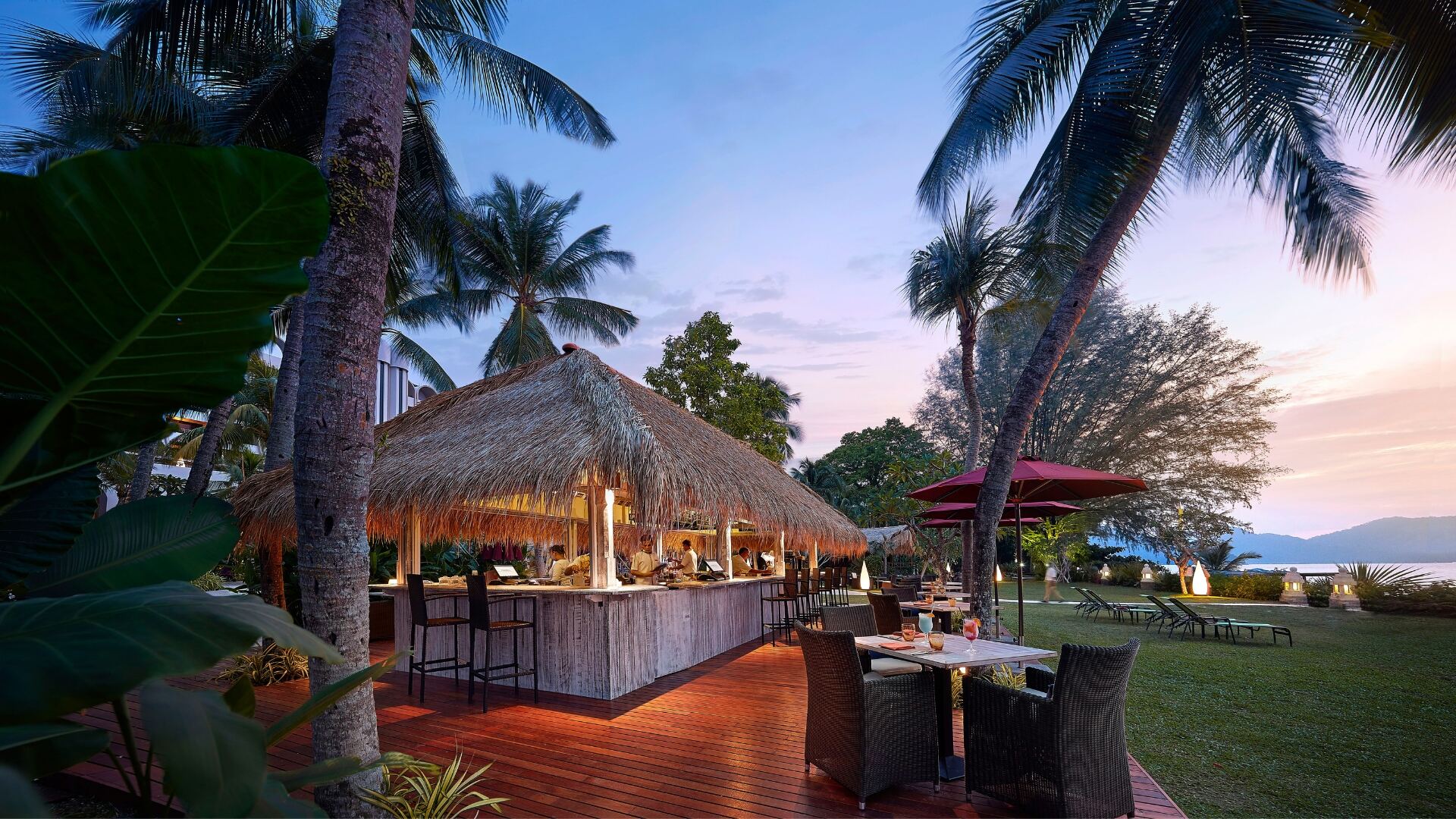 Sunset Bar — бар на 60 мест с живописным видом на море, где подаются различные закуски, напитки и коктейли. Вечер здесь начинается с закатом. В баре Sunset есть все необходимое для отдыха после долгого насыщенного дня: захватывающие виды на закат, пышные ландшафтные сады и освежающие напитки. Это лучший бар Пенанга для отдыха с широким выбором авторских коктейлей и ледяного пива.