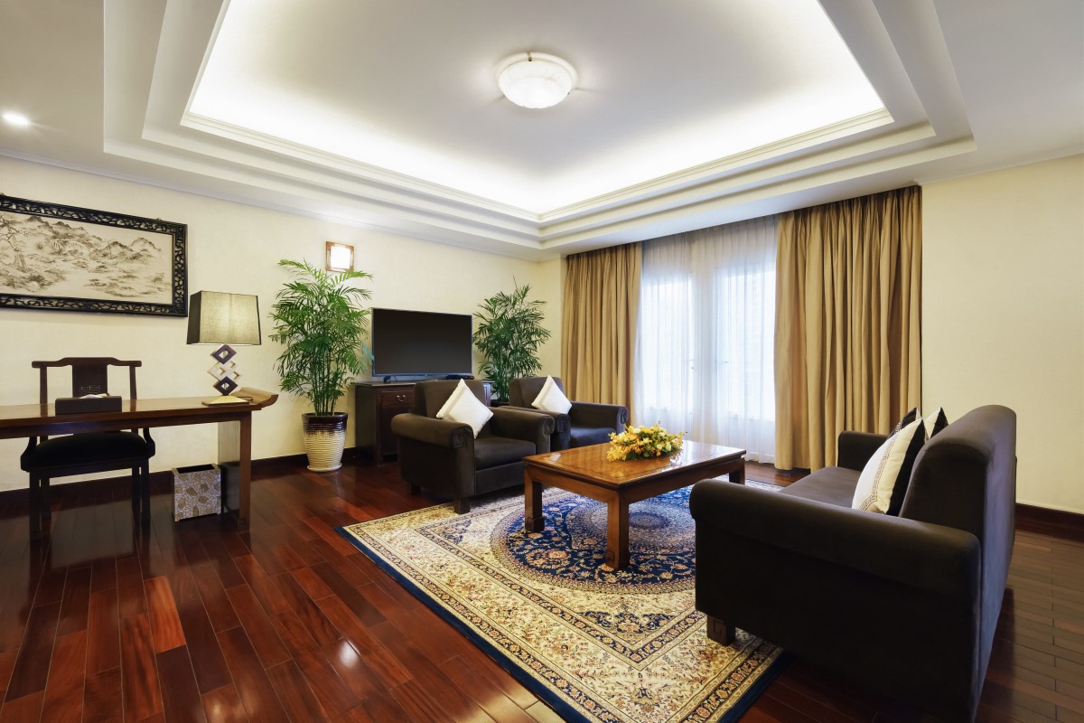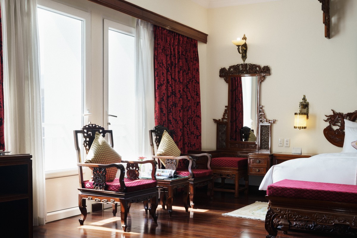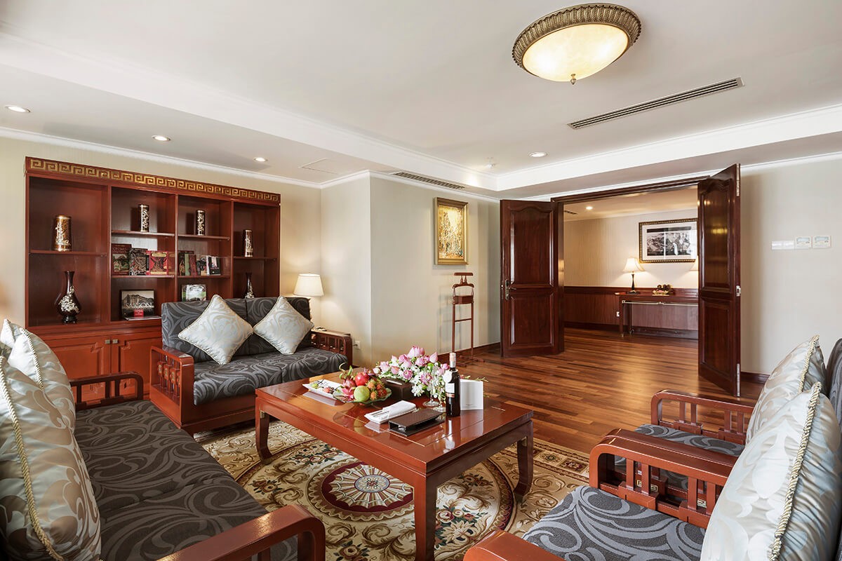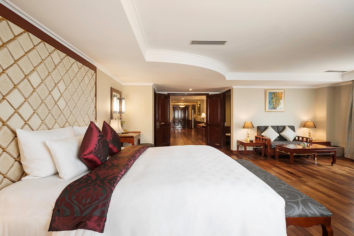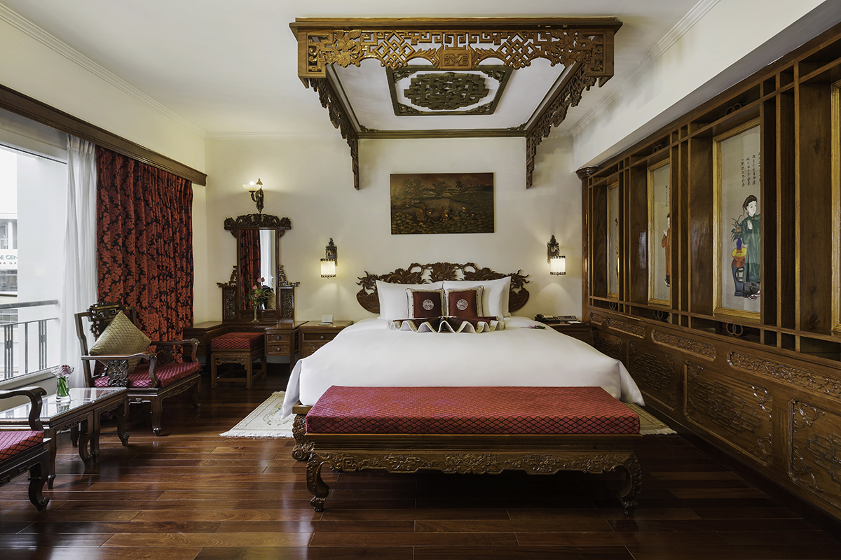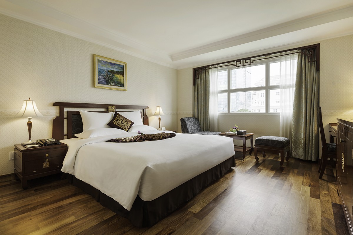 Гостям люксов доступны VIP-удобства. По запросу предоставляется дополнительная кровать. - Imperial Suite — расположенные на 3-м и 4-м этажах Восточного крыла отеля и сочетающие в себе комфорт и аутентичный вьетнамский традиционный декор императорские люксы площадью 98 кв.м, с лучшими видами на пешеходную улицу Нгуен Хюэ, состоящие из спальни с одной двуспальной кроватью King, рабочей зоны с письменным столом с док-станциями, отдельной гостиной комнаты, столовой зоны с обеденным столом, ванной комнаты с гидромассажной ванной-джакузи, отдельной душевой кабиной и сауной, балкона.