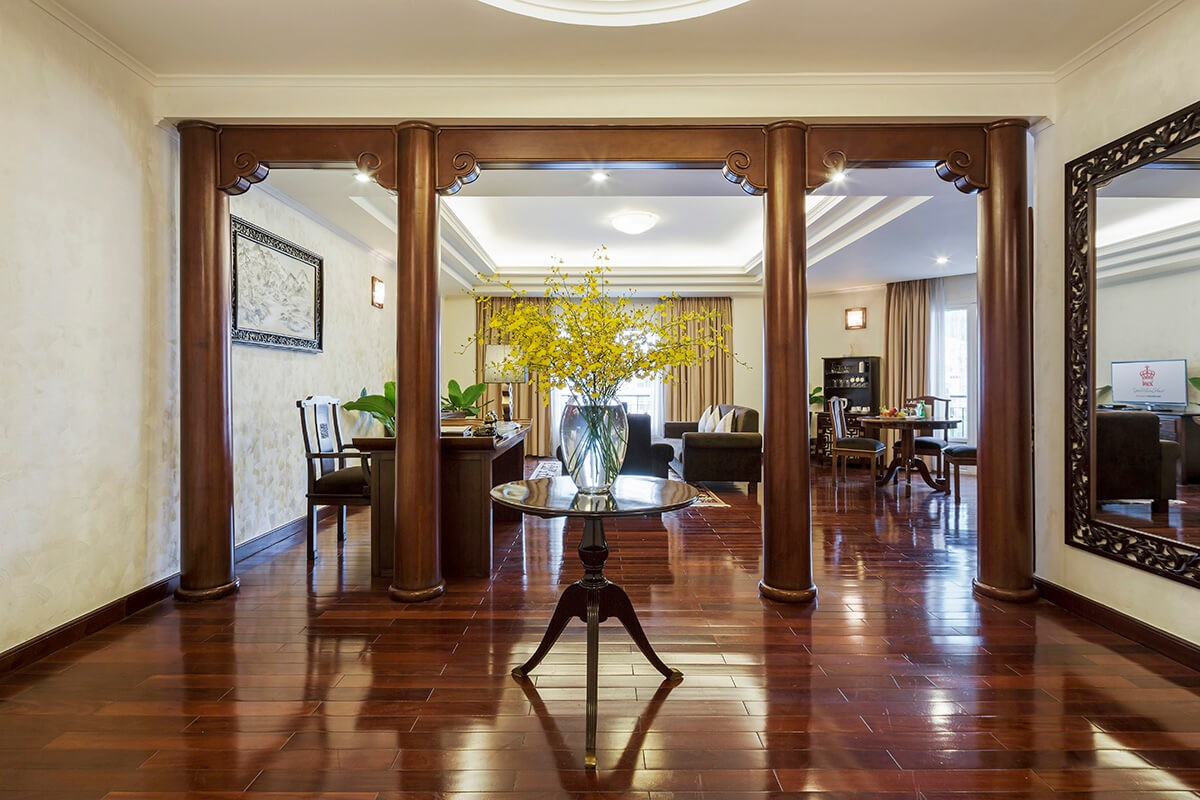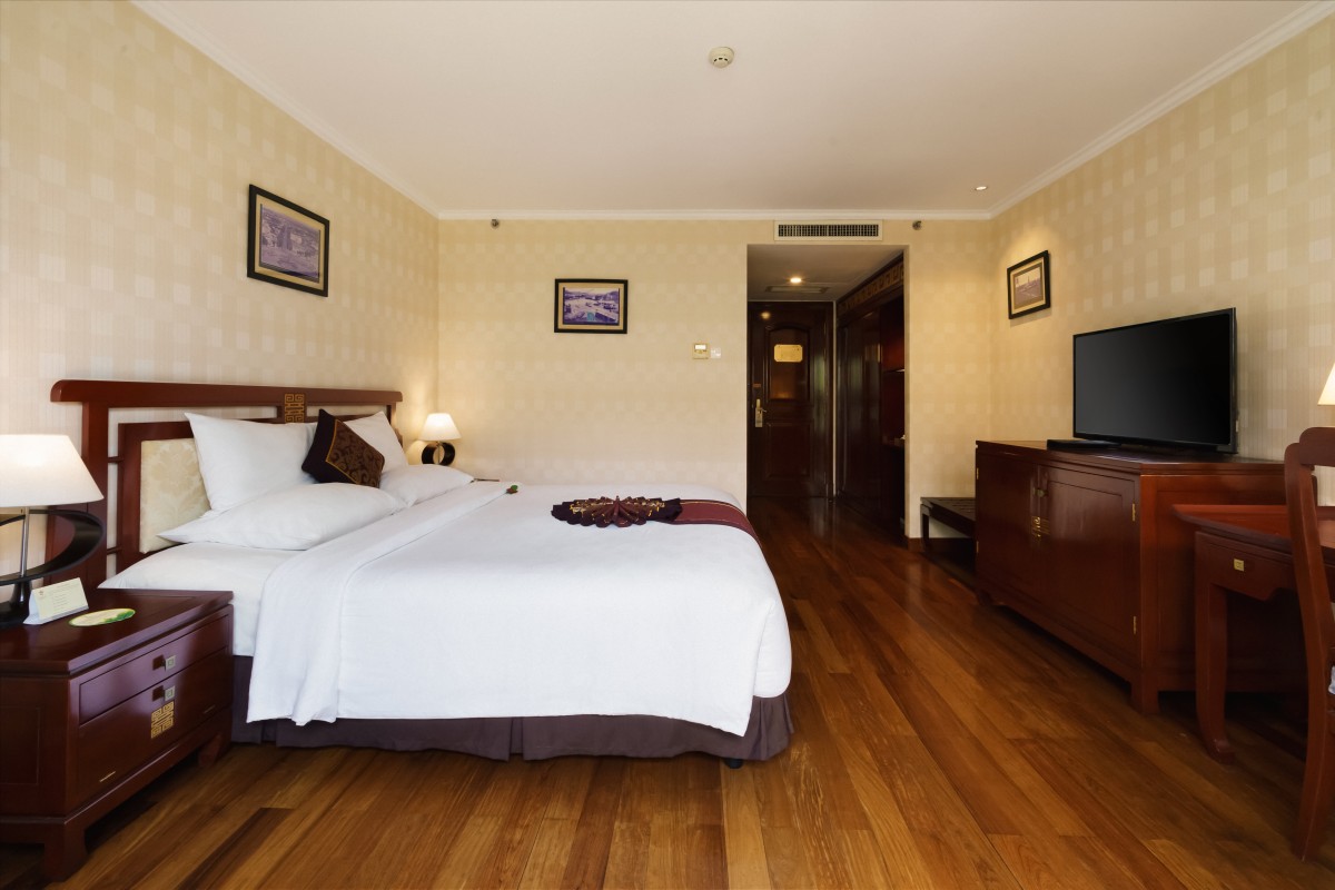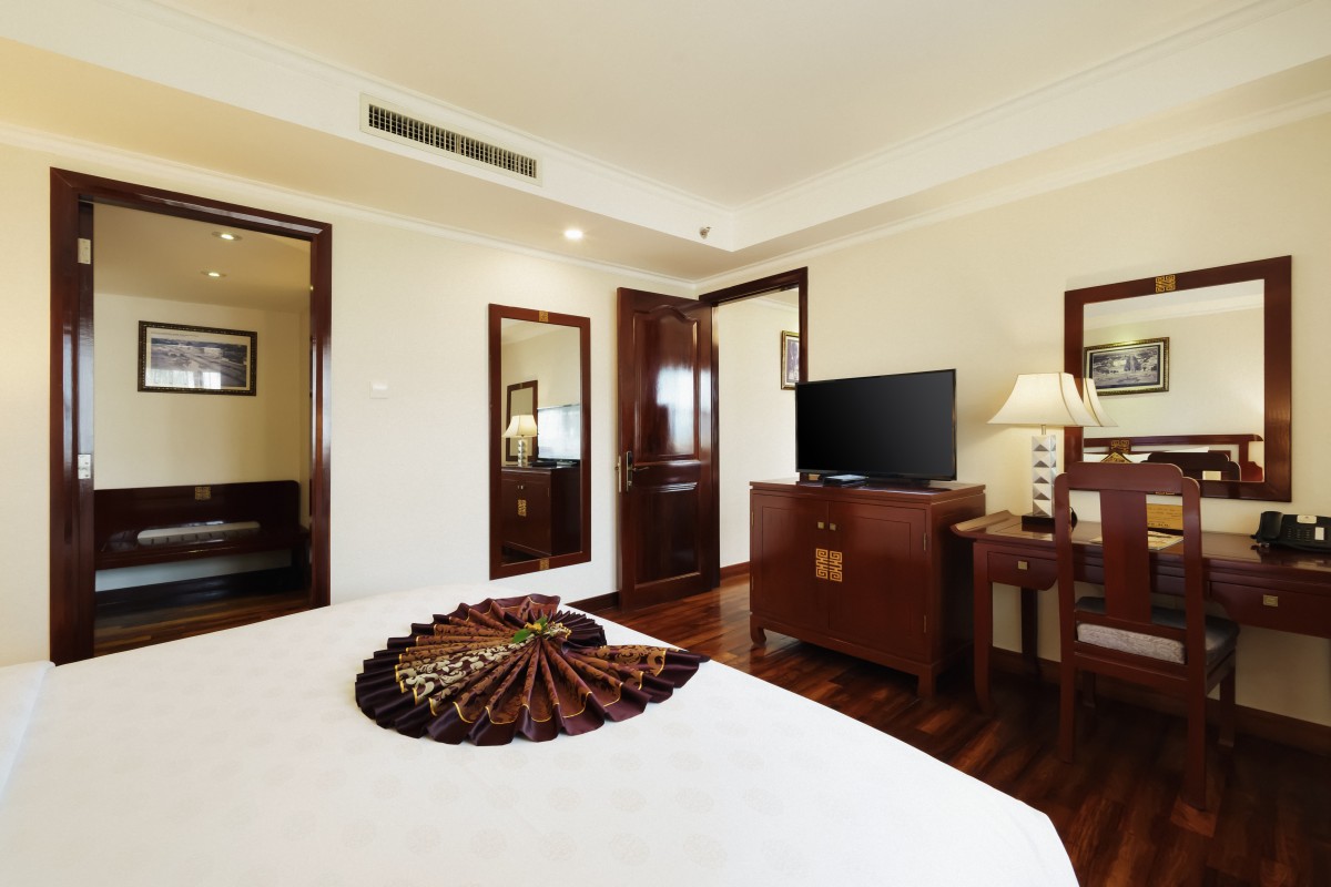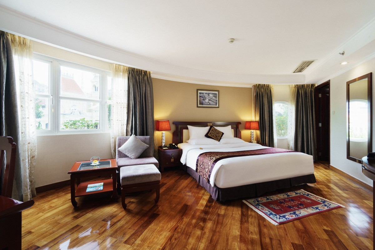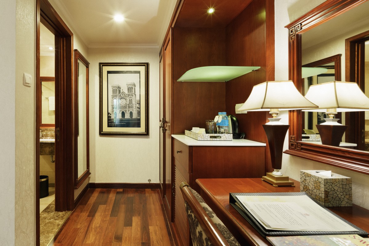 Гостям люксов доступны VIP-удобства. По запросу предоставляется дополнительная кровать. - Imperial Suite — расположенные на 3-м и 4-м этажах Восточного крыла отеля и сочетающие в себе комфорт и аутентичный вьетнамский традиционный декор императорские люксы площадью 98 кв.м, с лучшими видами на пешеходную улицу Нгуен Хюэ, состоящие из спальни с одной двуспальной кроватью King, рабочей зоны с письменным столом с док-станциями, отдельной гостиной комнаты, столовой зоны с обеденным столом, ванной комнаты с гидромассажной ванной-джакузи, отдельной душевой кабиной и сауной, балкона.