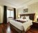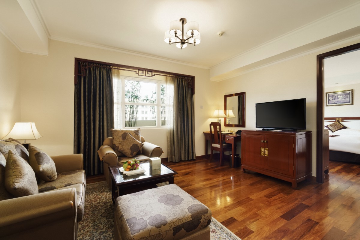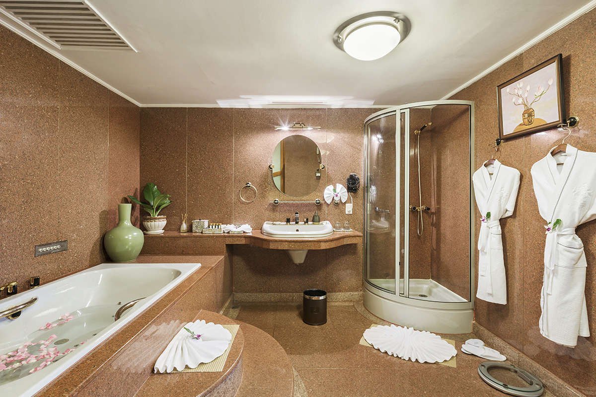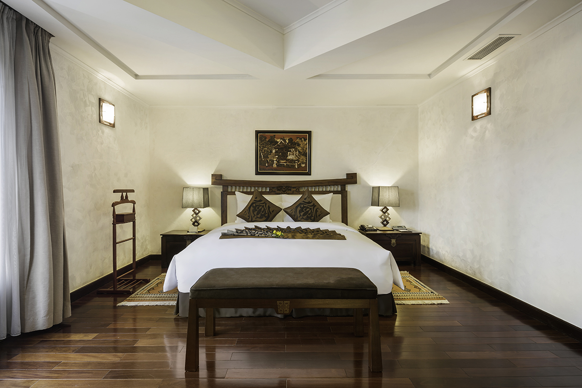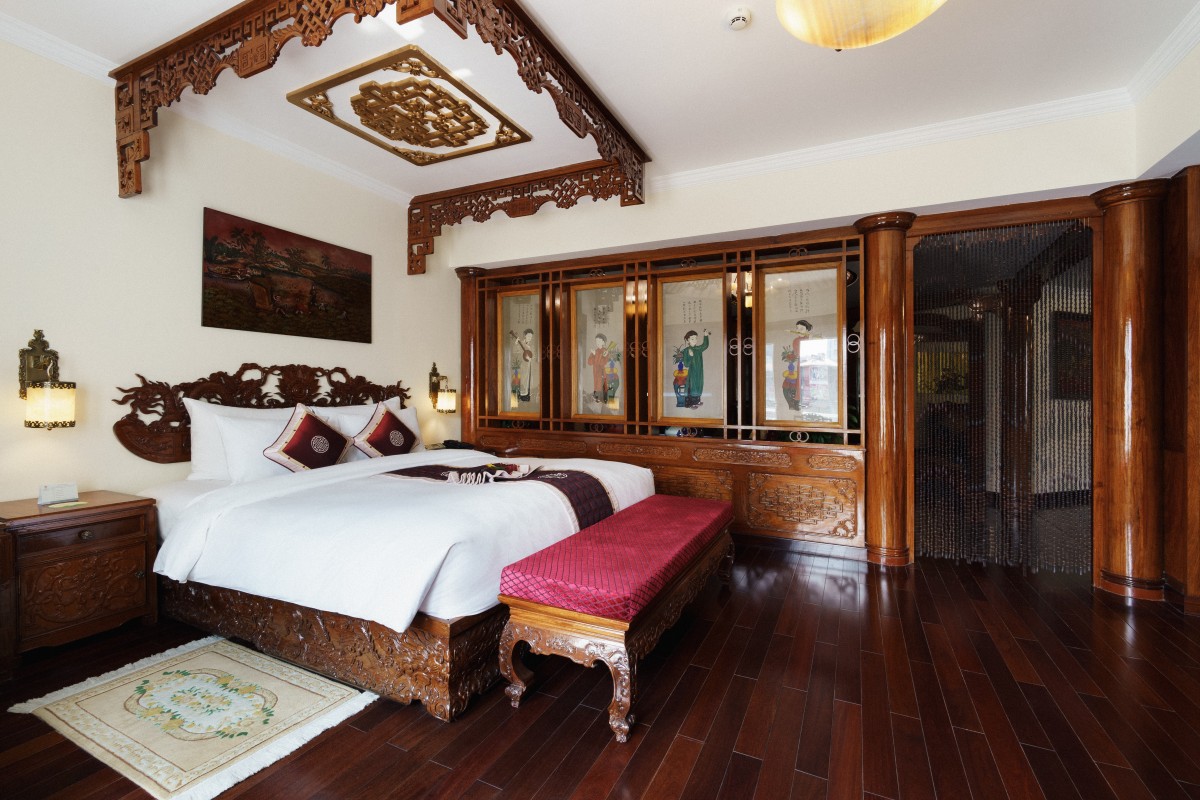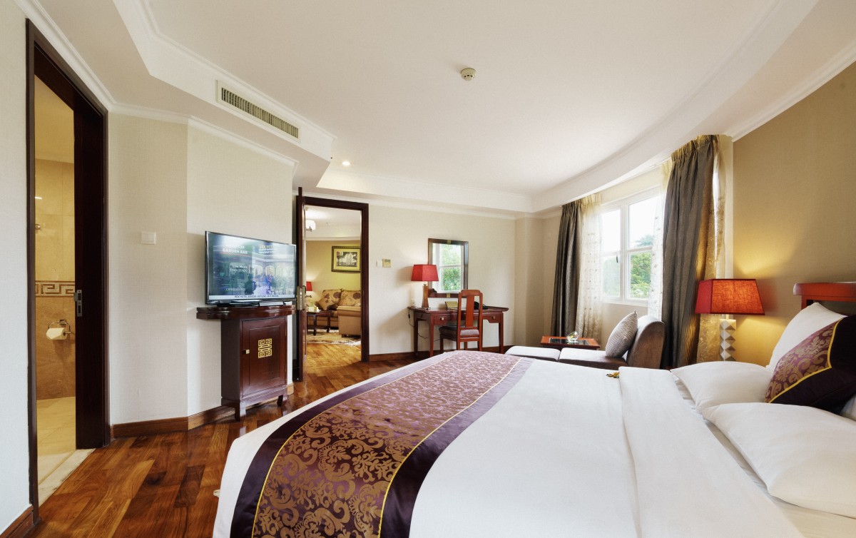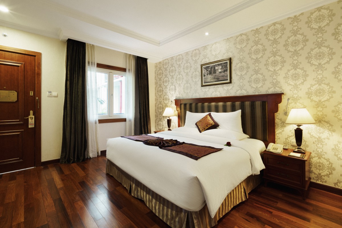Гостям люксов доступны VIP-удобства. По запросу предоставляется дополнительная кровать. - Imperial Suite — расположенные на 3-м и 4-м этажах Восточного крыла отеля и сочетающие в себе комфорт и аутентичный вьетнамский традиционный декор императорские люксы площадью 98 кв.м, с лучшими видами на пешеходную улицу Нгуен Хюэ, состоящие из спальни с одной двуспальной кроватью King, рабочей зоны с письменным столом с док-станциями, отдельной гостиной комнаты, столовой зоны с обеденным столом, ванной комнаты с гидромассажной ванной-джакузи, отдельной душевой кабиной и сауной, балкона.