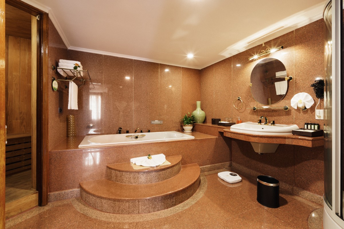 Гостям люксов доступны VIP-удобства. По запросу предоставляется дополнительная кровать. - Presidential Suite — расположенный на верхнем этаже представительского крыла элегантный, функциональный и современный президентский люкс площадью 200 кв.м, с потрясающим видом на центр города, состоящий из двух спален, каждая с двуспальной кроватью King, отдельной просторной гостиной комнаты с тщательно подобранной мебелью, рабочей зоны с письменным столом, оборудованной кухни с микроволновой печью, ванной комнаты с гидромассажной ванной-джакузи и отдельной душевой кабиной.