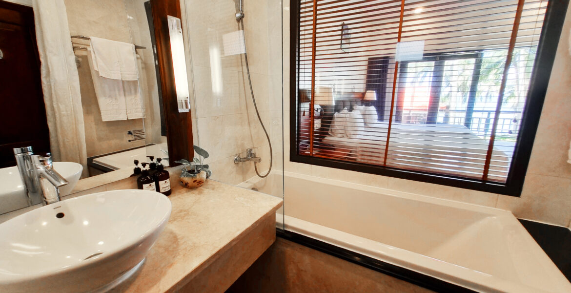 Рассчитаны для максимум 2 взрослых и 1 ребенка. За дополнительную плату доступна дополнительная кровать. - VIP Bungalow Sea View — 16 VIP-бунгало площадью 33 кв.м, с видом на сад, состоящих из спальни с одной двуспальной кроватью или двумя отдельными кроватями Twin, небольшой гостиной зоны, рабочей зоны с письменным столом, ванной комнаты с ванной и душевой кабиной, частного меблированного балкона. В некоторых VIP-бунгало есть ванна на открытом воздухе.