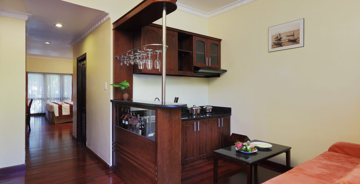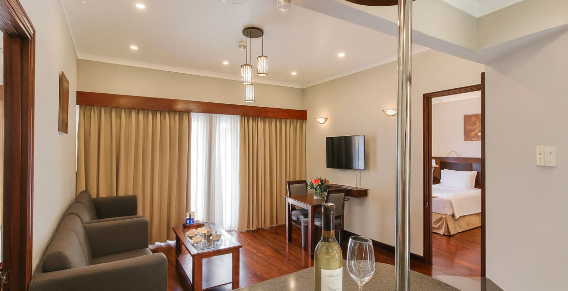 Рассчитаны для максимум 2 взрослых и 1 ребенка. За дополнительную плату доступна дополнительная кровать. - President Suite Garden View — 4 президентских люкса площадью 46 кв.м, с видом на сад, состоящих из спальни с одной двуспальной кроватью или двумя отдельными кроватями Twin, отдельной гостиной, столовой с обеденным столом, кухонной зоны, ванной комнаты с ванной и душевой кабиной, частного меблированного балкона.
