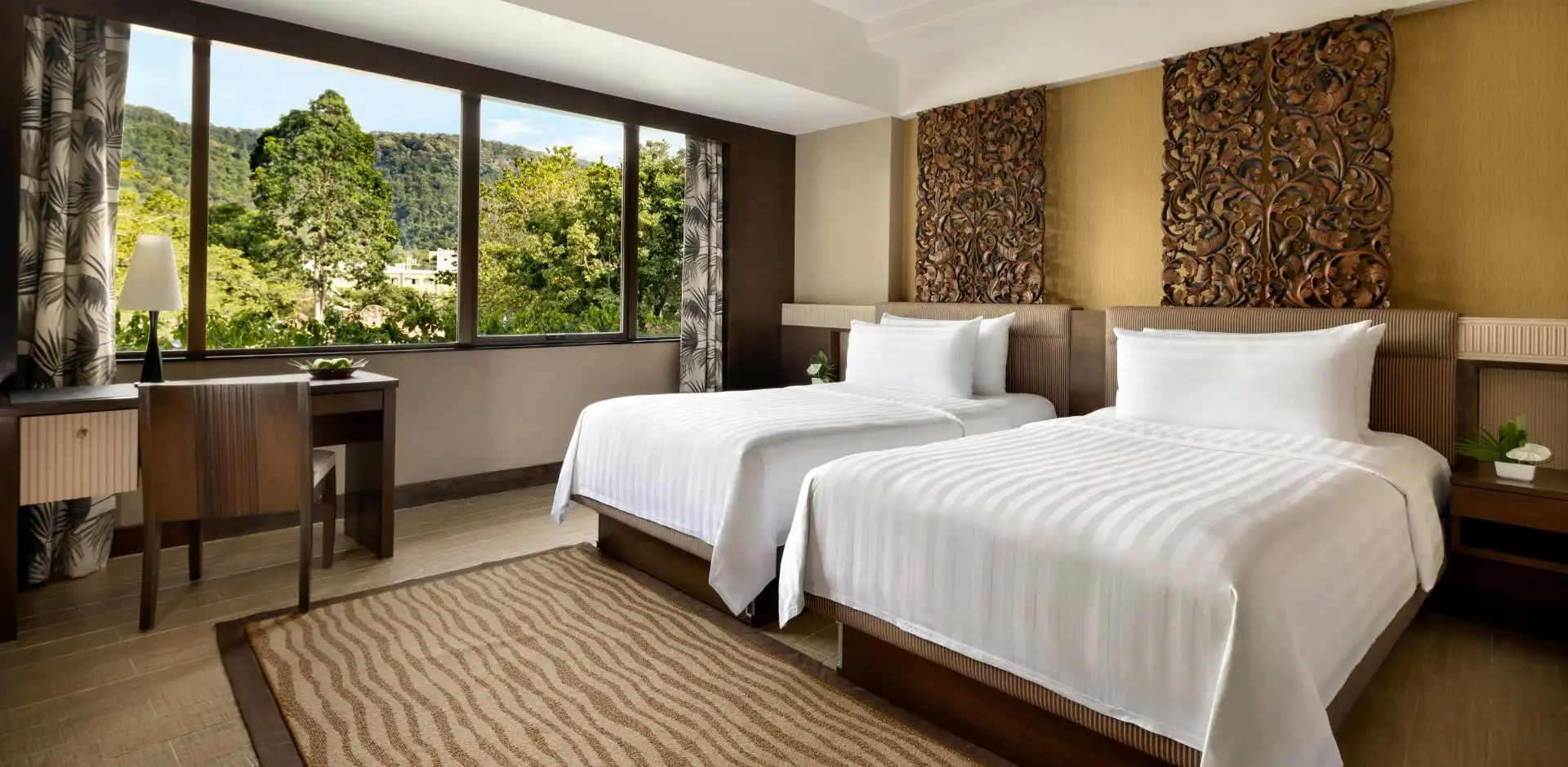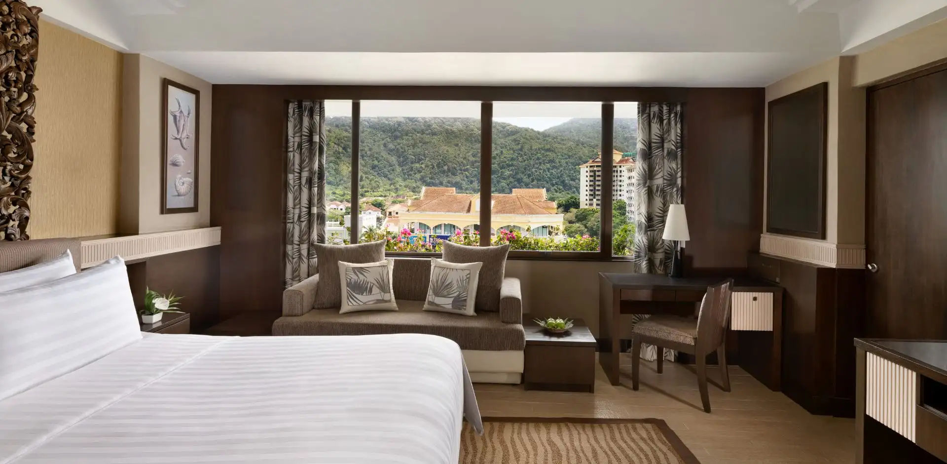 В каждом люксе можно установить только одну дополнительную кровать. В некоторых люксах установлена раскладная кровать Murphy, на которой легко разместятся дополнительные гости. В течение дня ее можно убрать, чтобы увеличить пространство. - Two Superior Rooms Connecting — представляющие собой два смежных улучшенных номера Superior Room площадью 72 кв.м, с видом на окрестности пригорода Бату Ферингги, состоящие из двух спален, одна из которых с одной двуспальной кроватью King-size, а вторая — с двумя односпальными кроватями Twin, каждая со своей гостиной и рабочей зонами, двух ванных комнат с ванной с душем или душевой кабиной.