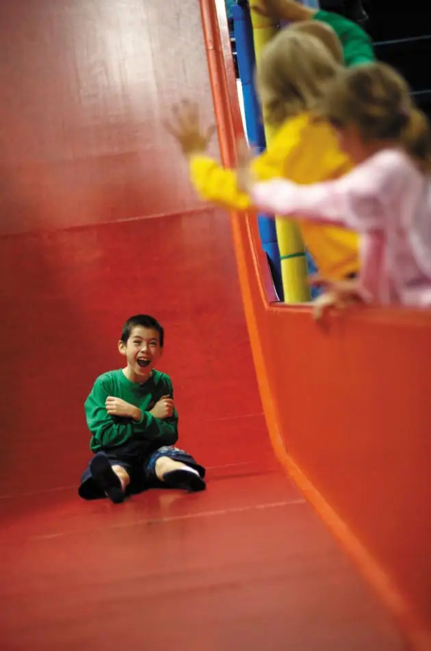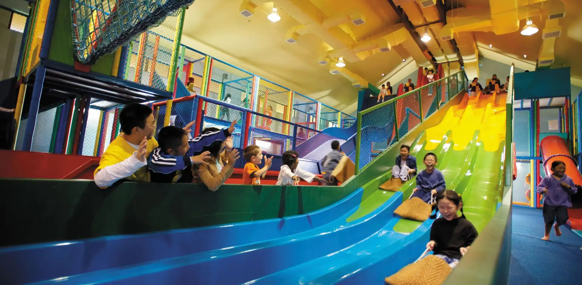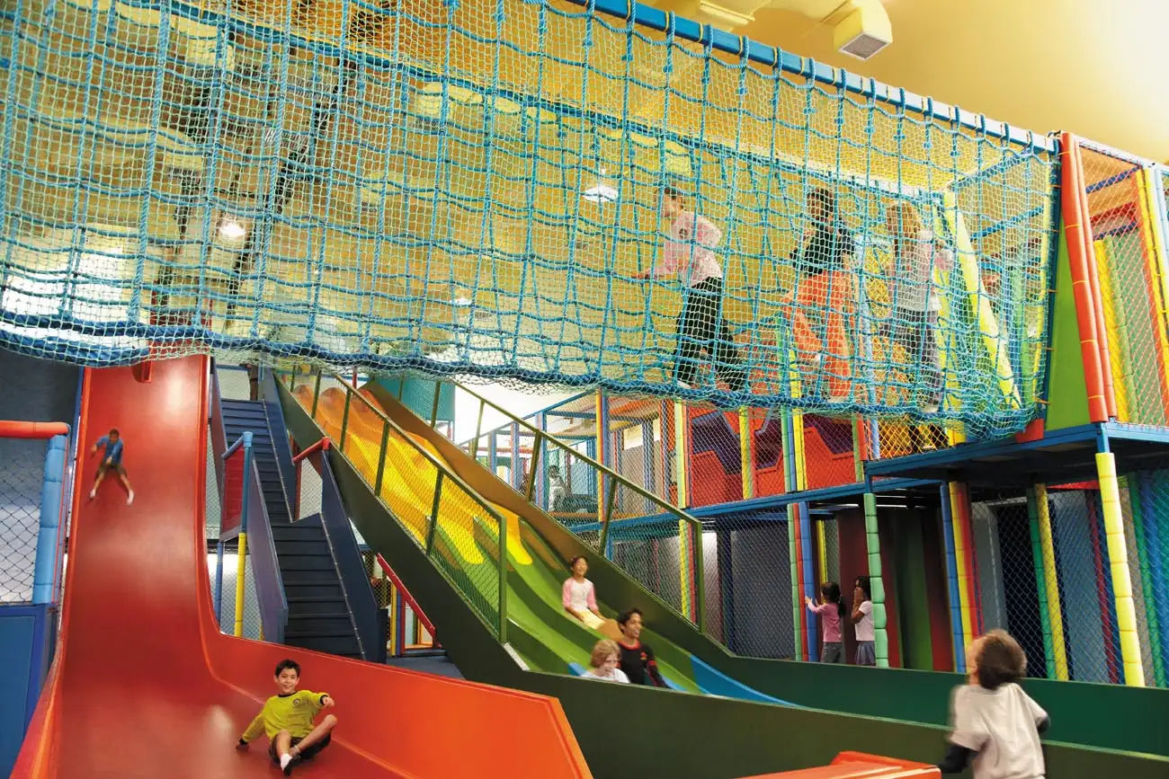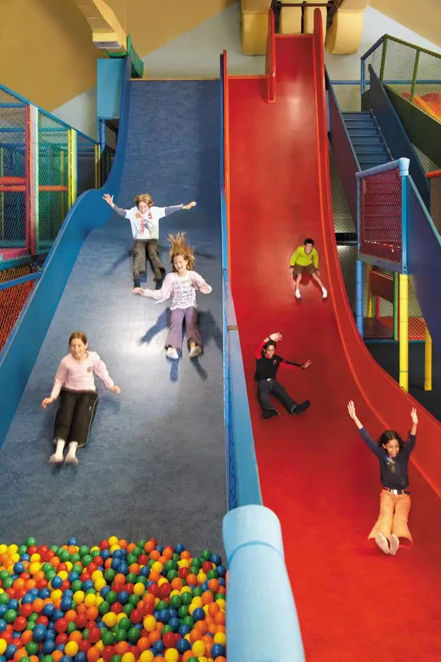 Зона приключений размещена в кондиционируемом помещении: три категории захватывающих горок и несколько секций модульного игрового оборудования создают веселую атмосферу для детей. Здесь также есть многофункциональная зона ресепшена, касса с закусками и напитками, зона для малышей и детские туалеты.