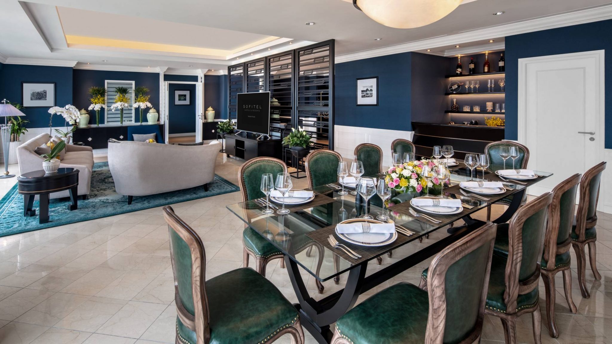 Гостям люксов предоставляется бесплатный доступ в клубный лаунж Sofitel Club Lounge на 18 этаже привилегиями, включая частную регистрацию заезда и выезда, завтрак и вечерние коктейли. - Presidential Suite — расположенный на 20-м этаже роскошный президентский люкс площадью 231 кв.м, состоящий из двух спален, одна из которых с одной эксклюзивной двуспальной кроватью King Sofitel MyBed™, а вторая — с двумя односпальными кроватями Twin Sofitel MyBed™, отдельной просторной гостиной комнаты, столовой зоны с обеденным столом на 8 персон, рабочей зоны с письменным столом, гардеробной, отделанной мрамором роскошной ванной комнаты с глубокой ванной и отдельной душевой кабиной с тропическим душем.