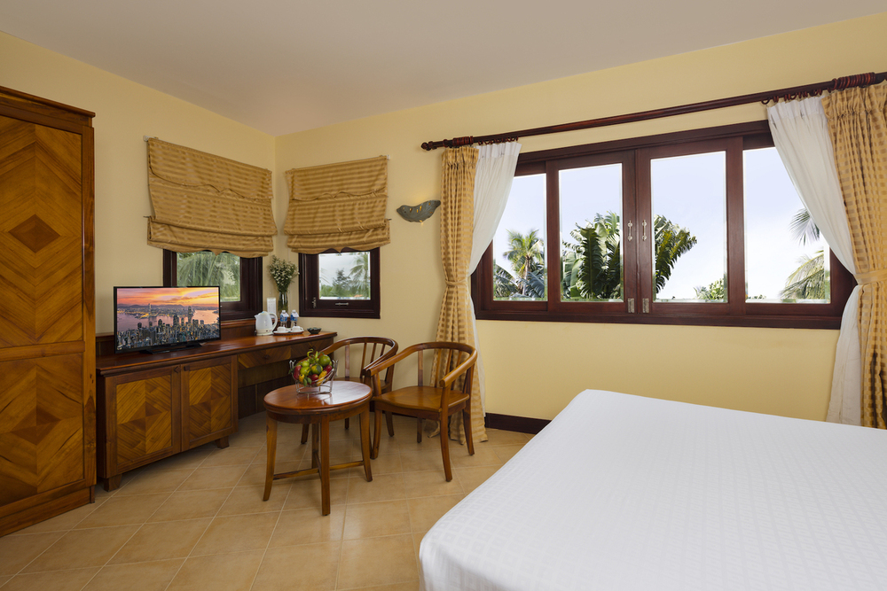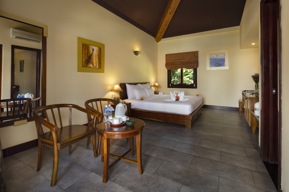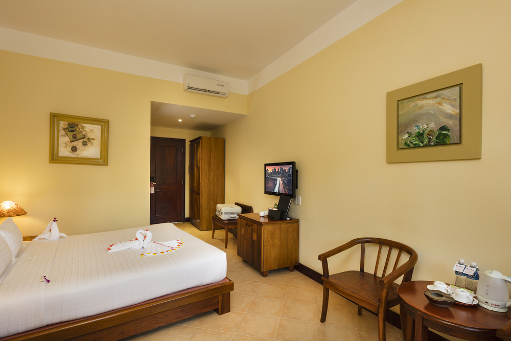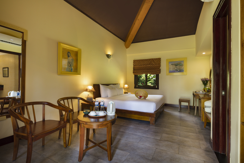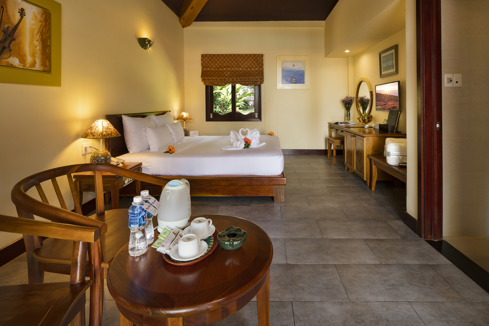 - Bungalow Superior Garden View — расположенные посреди тропического сада, всего в нескольких шагах от пляжа комфортные улучшенные номера-бунгало, состоящие из спальни, уютно обставленной гостиной зоны, рабочей зоны с письменным столом, ванной комнаты. В номерах дополнительно есть потолочный вентилятор.