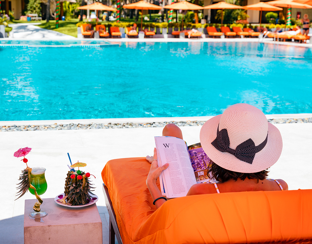 Если захочется перекусить или выпить, вам не нужно никуда идти, все это будет доступно прямо в бассейне. Просто запрыгните на подводный стульчик и закажите себе закуску или напиток, слушая пляжную музыку.