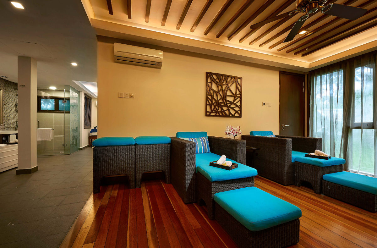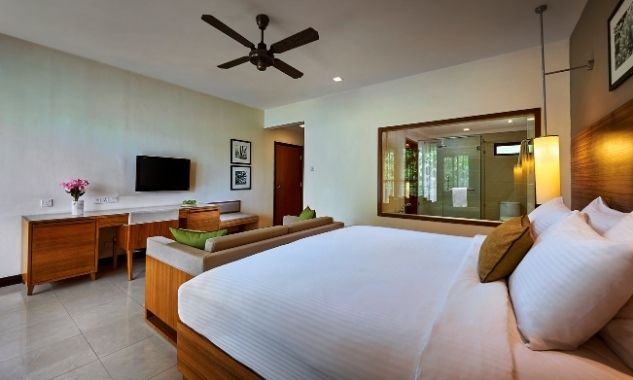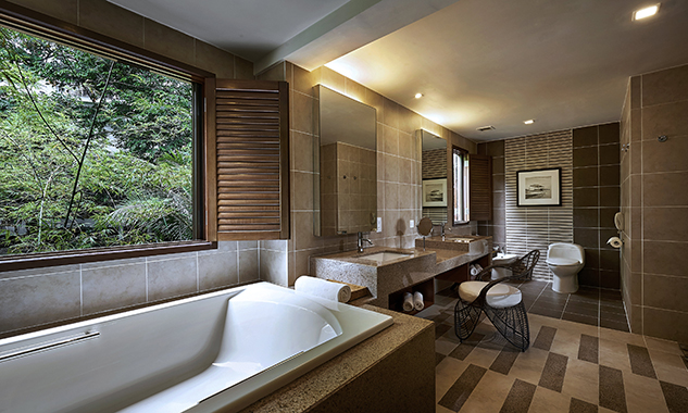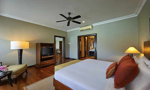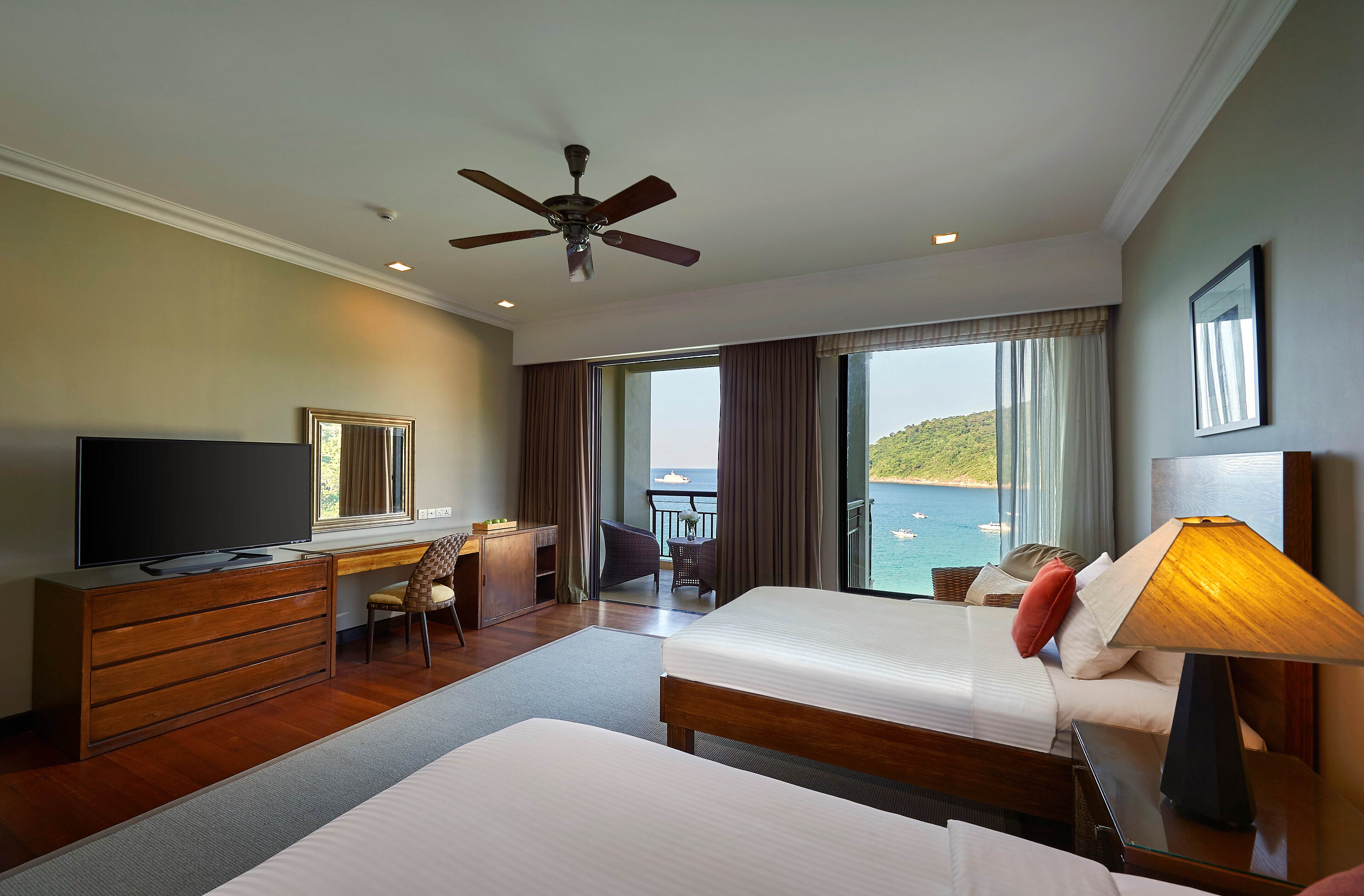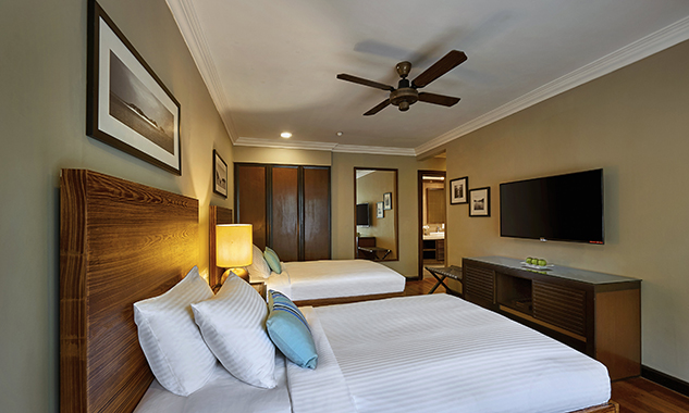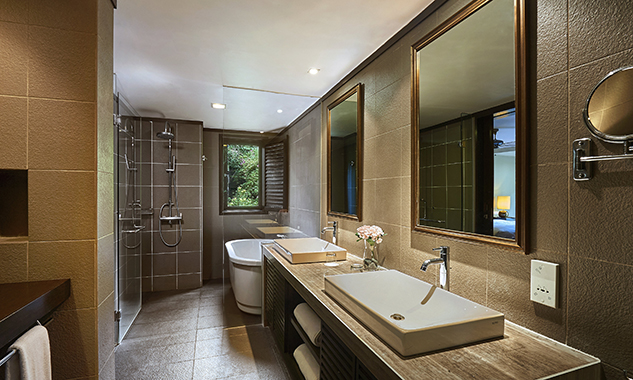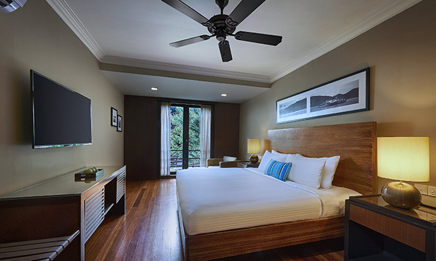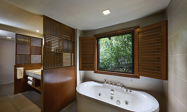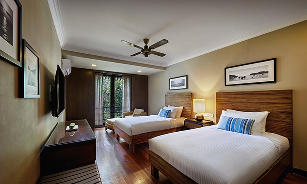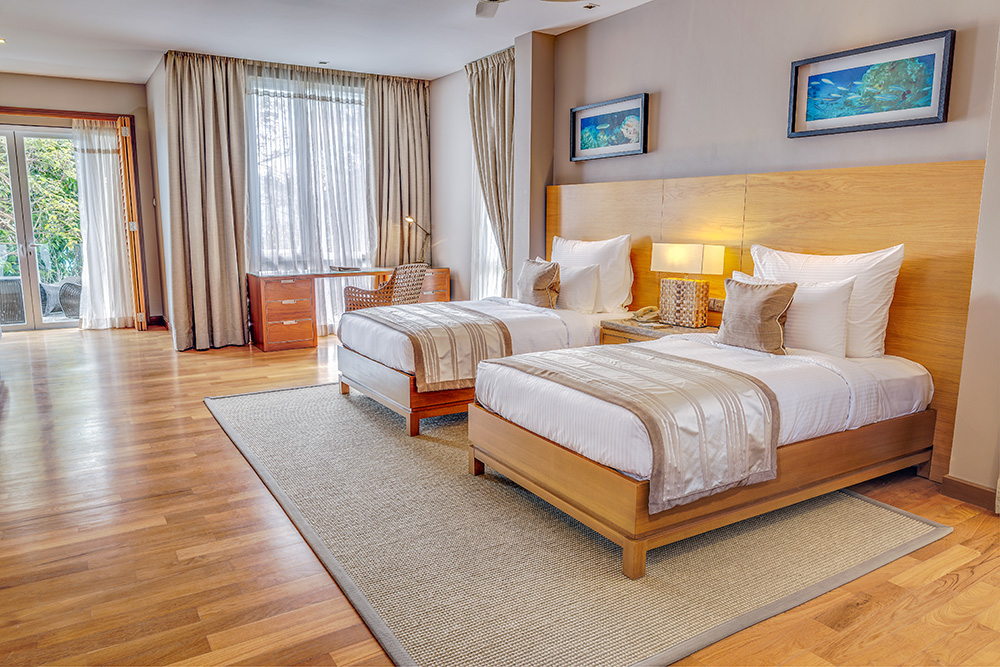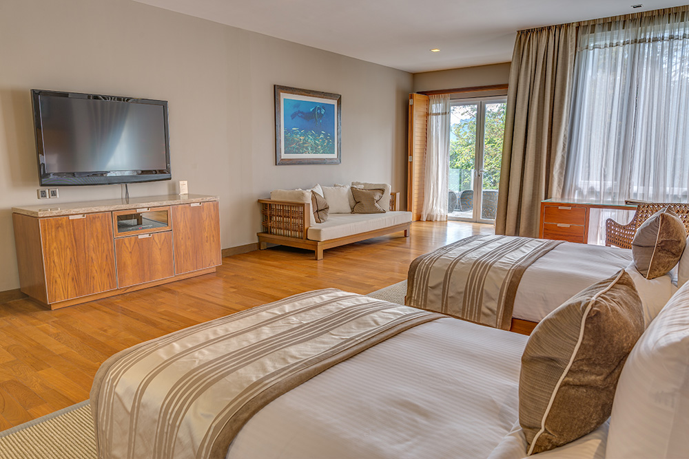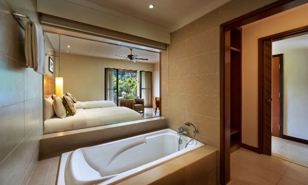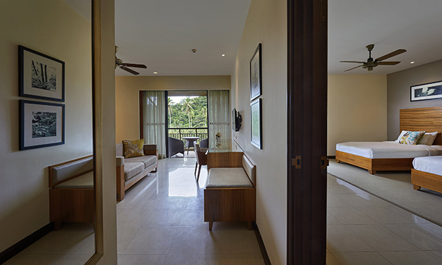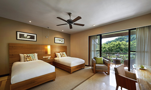 В люксе дополнительно есть ароматические свечи с натуральными ароматами; бесплатный мини-бар с фирменными напитками и закусками пополняется ежедневно. - Two-Bedroom Hillview Deluxe — элегантно расположенный на склоне холма номер площадью 92 кв.м, состоящий из двух смежных номеров. В одной спальне установлена одна большая кровать King-size, а во второй — две односпальные кровати Twin, что делает его идеальным вариантом для комфортного размещения семей с детьми или путешествующих вместе друзей. В каждой спальне есть собственный меблированный балкон с захватывающим видом на тропическую растительность. Ванная комната оборудована ванной и отдельной душевой кабиной с тропическим душем.