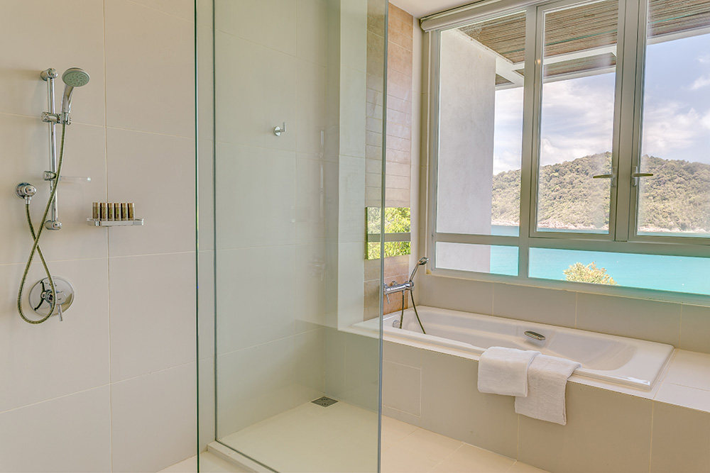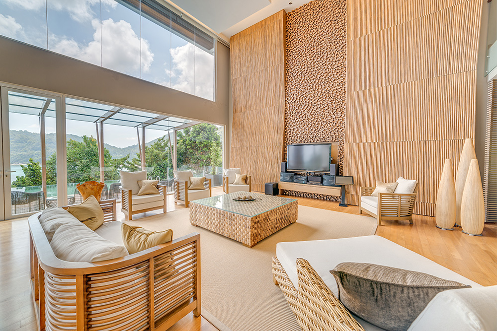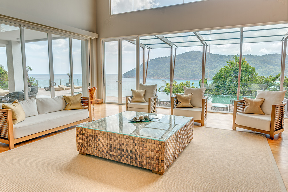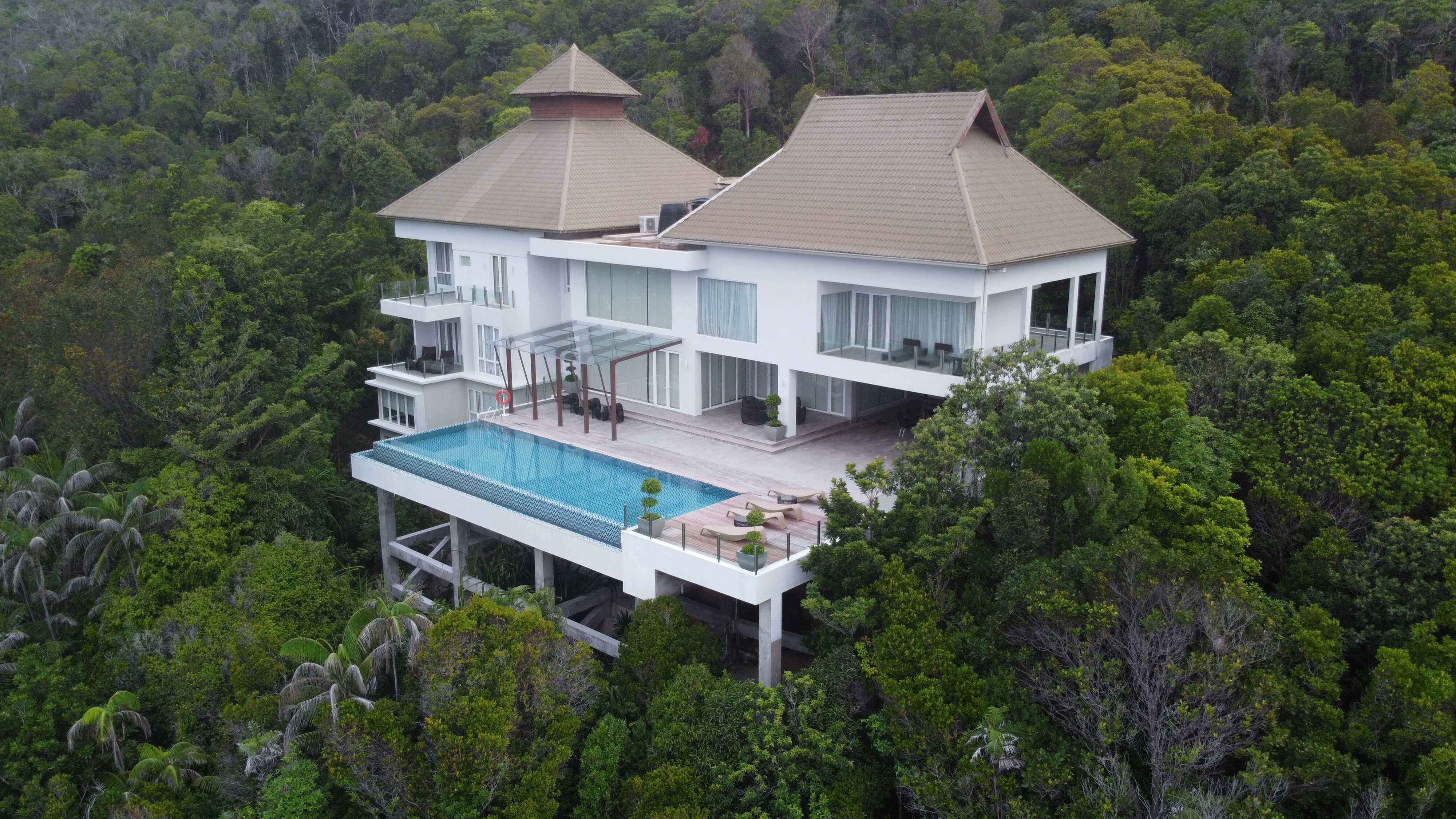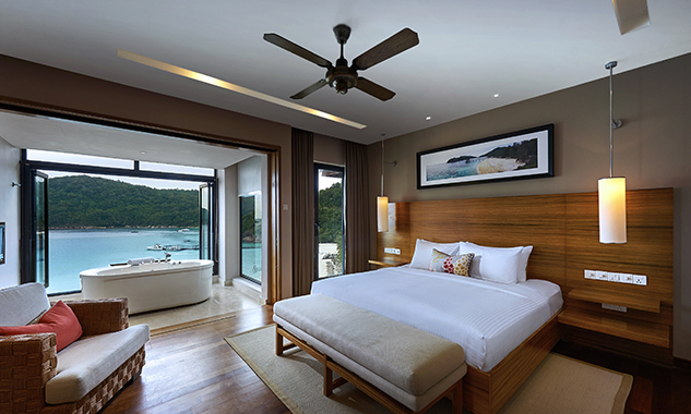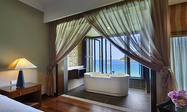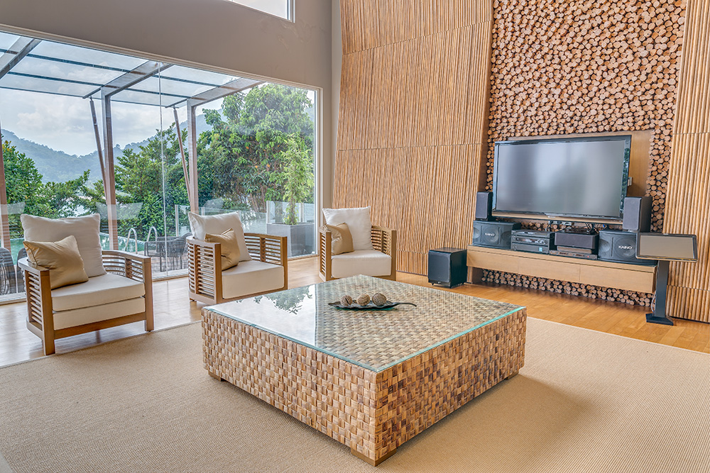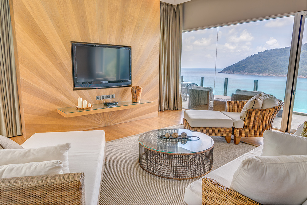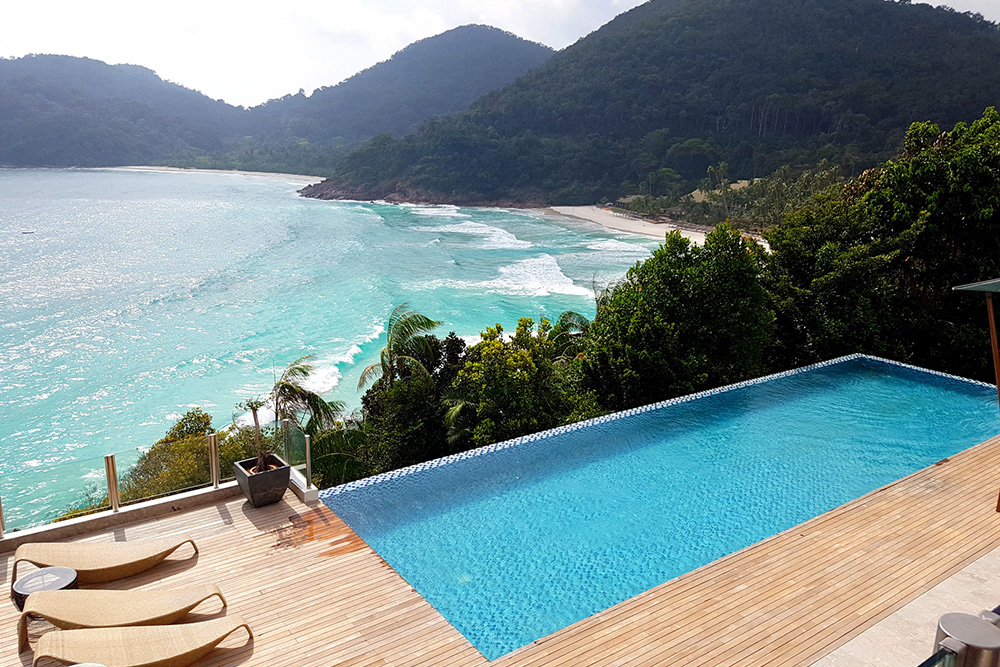 Гостям предоставляются услуги личного дворецкого. - The Taaras Villa — расположенная на вершине скалы и идеально подходящая для тех, кто ищет полного уединения роскошная частная вилла площадью более 1440 кв.м, с отдельным входом и потрясающим видом на Южно-Китайское море, состоящая из пяти спален, просторных гостиных и столовых внутри и снаружи, оборудованной мини-кухни, оборудованного тренажерного зала, гардеробных, ванных комнат (ванная комната при главной спальне с большой круглой ванной и LCD-телевизором), меблированных террас, частного пейзажного бассейна с видом на океан.