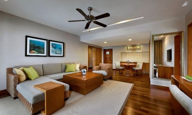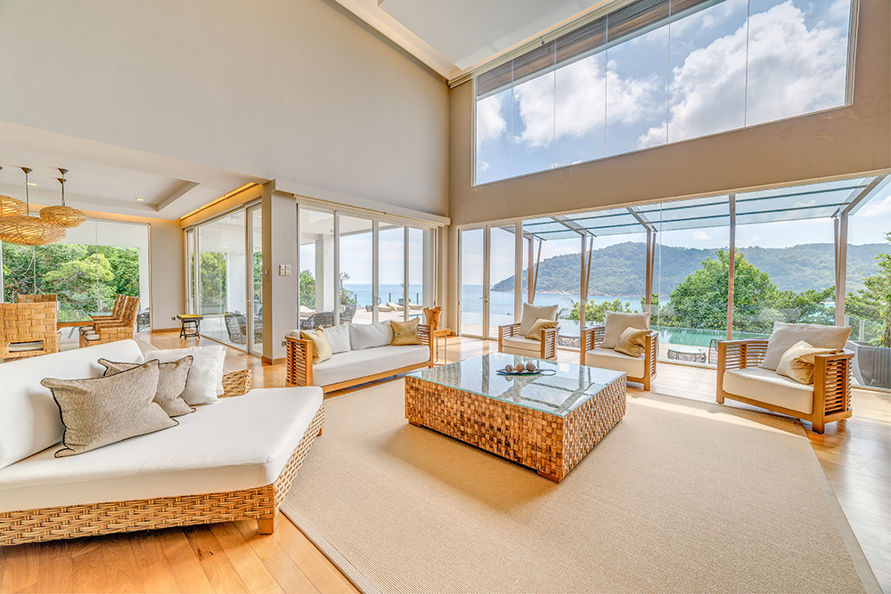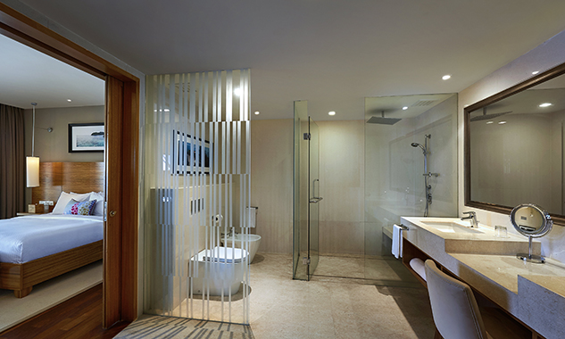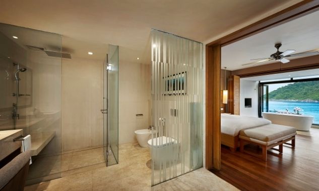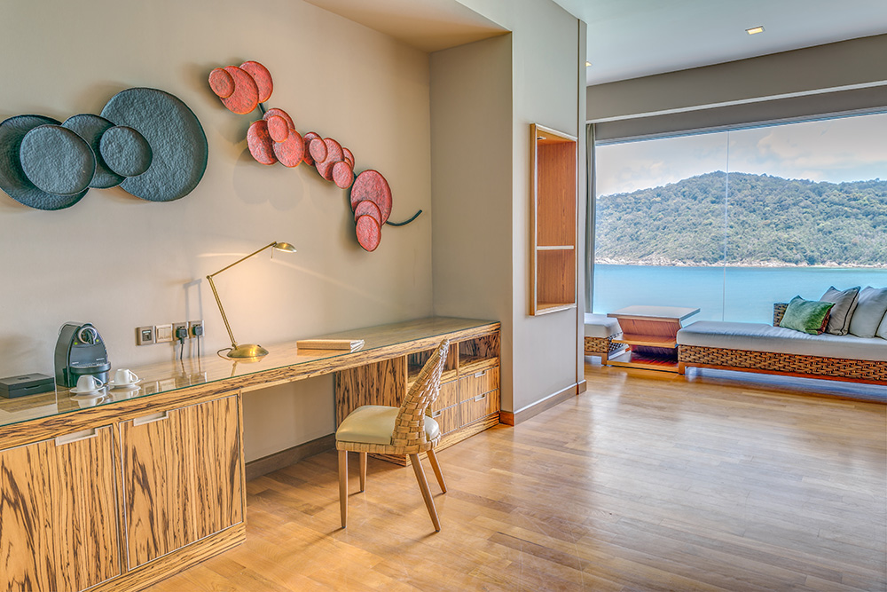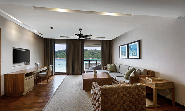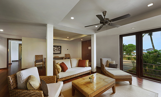 Люкс можно объединить с номером Cliff Premier Twin для комфортного семейного отдыха или путешествующих с друзьями. - Ocean Front Suite — расположенный на пляже и оформленный в азиатском стиле люкс площадью 80 кв.м, состоящий из спальни с одной большой кроватью King-size, отдельной просторной гостиной комнаты, гардеробной, большой ванной комнаты с ванной, отдельной душевой с тропическим душем, частной меблированной веранды, где можно наслаждаться бризом, любуясь бирюзовым океаном.