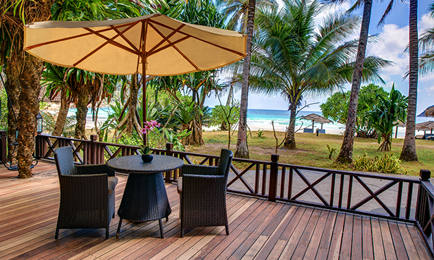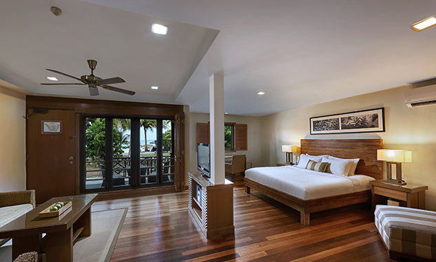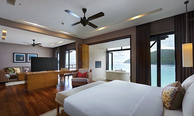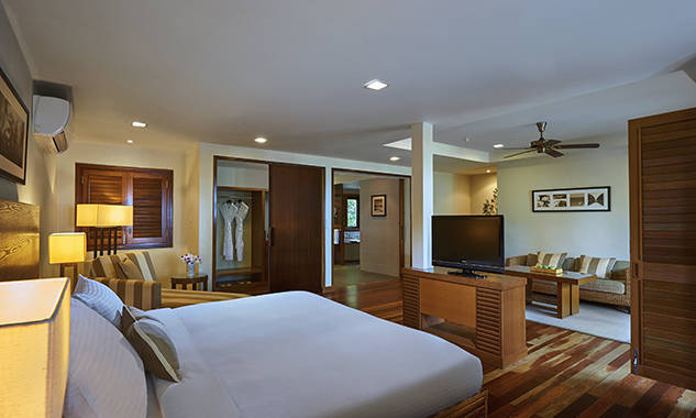 Бесплатный мини-бар с фирменными напитками и закусками пополняется ежедневно. - Ocean Front Master Suite — расположенный прямо на пляже, единственный в своем роде на курорте роскошный люкс площадью 140 кв.м, с паркетным полом, с видом на океан, состоящий из спальни с одной большой кроватью King-size, отдельной просторной гостиной комнаты, столовой зоны с обеденным столом, буфета с угощениями, гардеробной, ванной комнаты с натуральным полом, с ванной, джакузи, отдельной душевой кабиной с тропическим душем и LCD-телевизором, частного меблированного балкона с видом на океан.