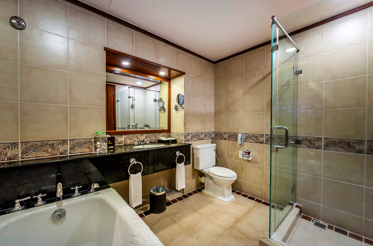 Рассчитаны для максимум 4 гостей. - Grand Deluxe Queen Bed Room — расположенные вдоль пляжа и оснащенные всем необходимым для комфортного отдыха номера площадью 42 кв.м, состоящие из спальни с одной двуспальной кроватью Queen-size, уютно обставленной гостиной зоны, рабочей зоны с письменным столом, гардеробной, ванной комнаты с ванной и отдельной душевой кабиной, частного меблированного балкона.